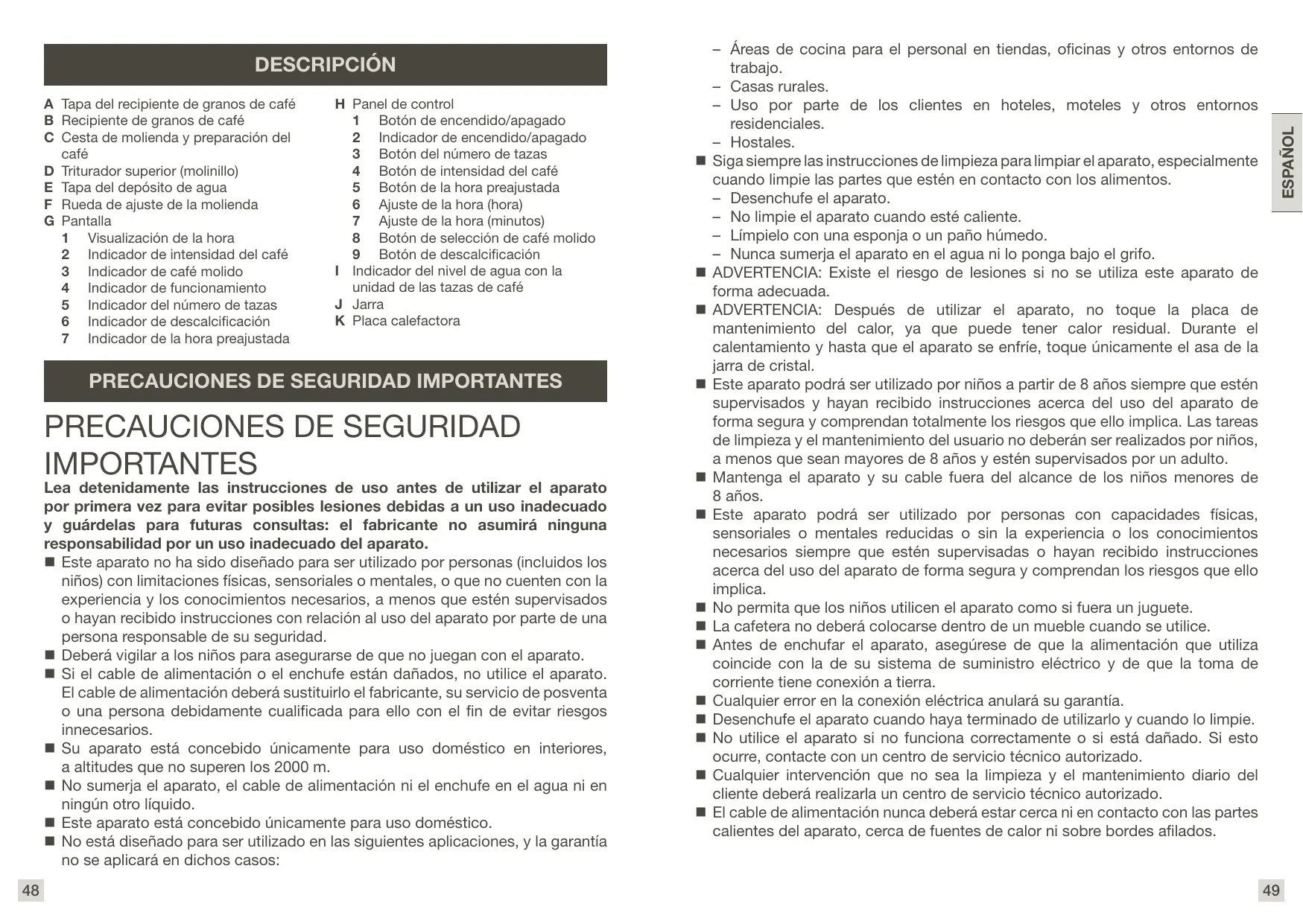 No tire del cable para desenchufar el aparato. Nunca meta la jarra de café en el microondas ni la ponga al fuego ni sobre placas de cocina eléctricas. No llene de agua el aparato si aún está caliente. Todos los aparatos se someten a estrictos procedimientos de control de calidad. Dichos procedimientos incluyen pruebas de uso real con aparatos seleccionados aleatoriamente, lo cual explica que pueda haber signos de uso. Cierre siempre la tapa cuando la cafetera esté en funcionamiento. Para la función de Molinillo: – Apague el aparato y desconéctelo de la corriente antes de cambiar los accesorios o acercarse a las piezas móviles durante el uso. – Desconecte siempre el aparato de la corriente si lo va a dejar desatendido y antes de montarlo, desmontarlo o limpiarlo. – Esta función no deberá ser utilizada por niños. Mantenga el aparato y su cable fuera del alcance de los niños. – La función de Molinillo podrá ser utilizada por personas con capacidades físicas, sensoriales o mentales reducidas o sin la experiencia y los conocimientos necesarios si están supervisadas o han recibido instrucciones acerca del uso de la función de Molinillo de forma segura y comprenden los riesgos que ello implica. – Los niños no deberán jugar con la función de Molinillo. No prepare café si la jarra ya tiene café. Para evitar derrames, deberá colocar la jarra sobre la base calefactora de la cafetera; de lo contrario, podría derramarse agua o café caliente. La cafetera alcanza temperaturas muy elevadas durante el ciclo de infusión. Manipúlela con cuidado. No desmonte el aparato. No utilice la jarra sin la tapa. No eche agua caliente en los depósitos. La cafetera no deberá colocarse dentro de un mueble cuando se utilice. No utilice granos muy oleaginosos que podrían dañar el aparato.