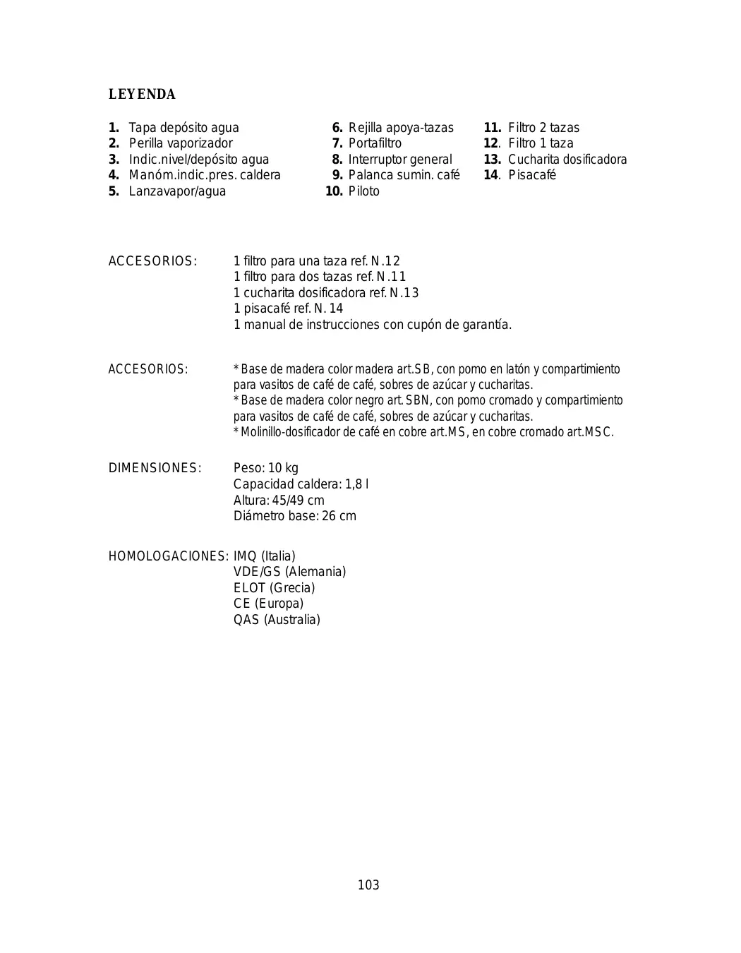 M) Laquina está provista de vaporizador N. 5 para capuchino, ponche, chocolate en taza y tí.