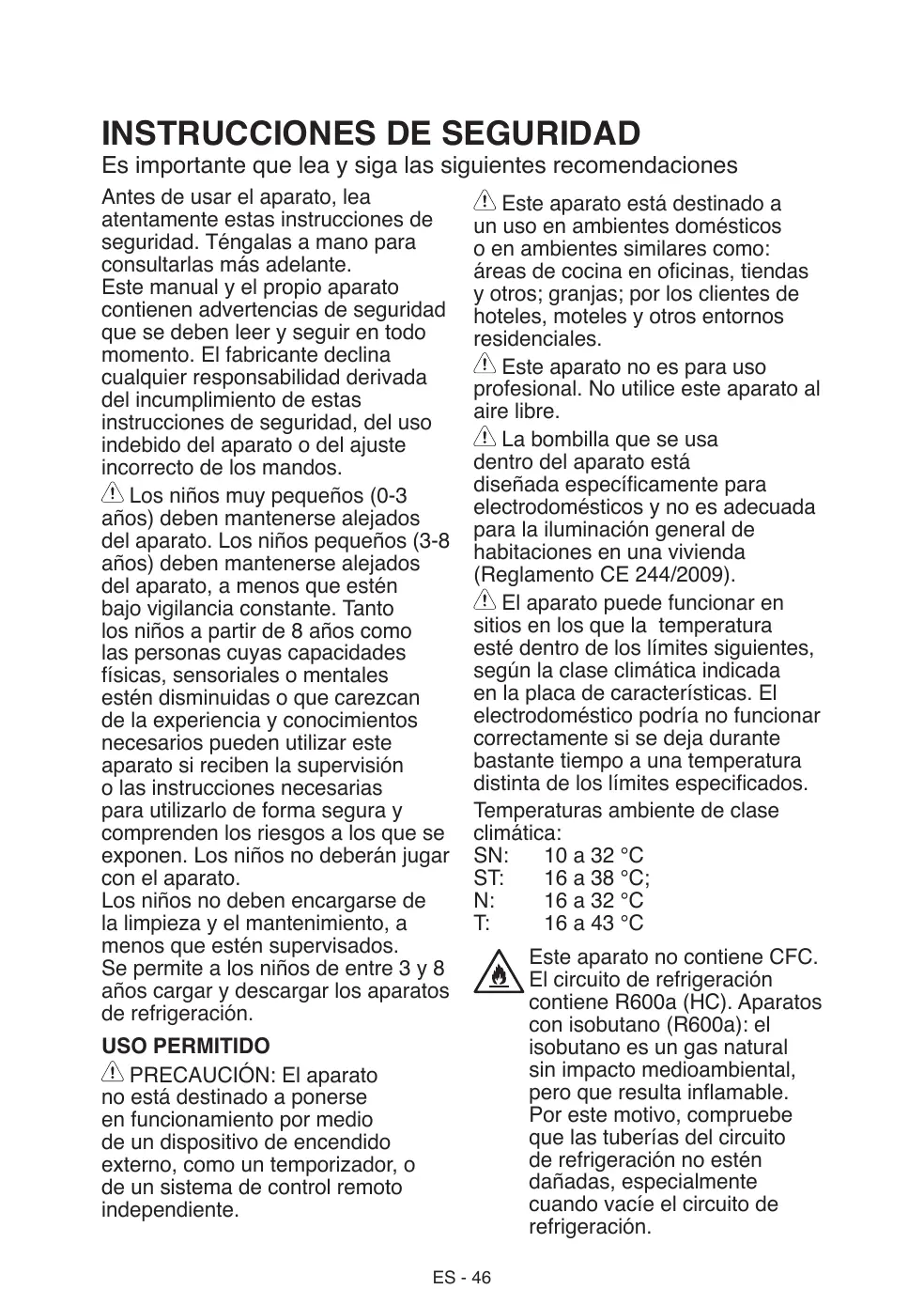 Antes de usar el aparato, lea atentamente estas instrucciones de seguridad. Téngalas a mano para consultarlas más adelante. Este manual y el propio aparato contienen advertencias de seguridad que se deben leer y seguir en todo momento. El fabricante declina cualquier responsabilidad derivada del incumplimiento de estas instrucciones de seguridad, del uso indebido del aparato o del ajuste incorrecto de los mandos. Los niños muy pequeños (0-3 años) deben mantenerse alejados del aparato. Los niños pequeños (3-8 años) deben mantenerse alejados del aparato, a menos que estén bajo vigilancia constante. Tanto los niños a partir de 8 años como las personas cuyas capacidades físicas, sensoriales o mentales estén disminuidas o que carezcan de la experiencia y conocimientos necesarios pueden utilizar este aparato si reciben la supervisión o las instrucciones necesarias para utilizarlo de forma segura y comprenden los riesgos a los que se exponen. Los niños no deberán jugar con el aparato. Los niños no deben encargarse de la limpieza y el mantenimiento, a menos que estén supervisados. Se permite a los niños de entre 3 y 8 años cargar y descargar los aparatos de refrigeración.