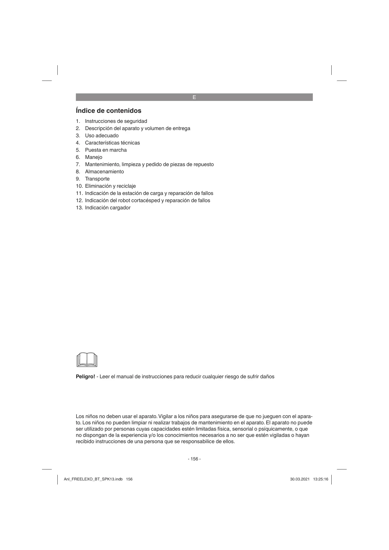Descripción del aparato y volumen de entrega Uso adecuado Características técnicas Puesta en marcha Manejo Mantenimiento, limpieza y pedido de piezas de repuesto Almacenamiento Transporte Eliminación y reciclaje Indicación de la estación de carga y reparación de fallos Indicación del robot cortacésped y reparación de fallos Indicación cargador