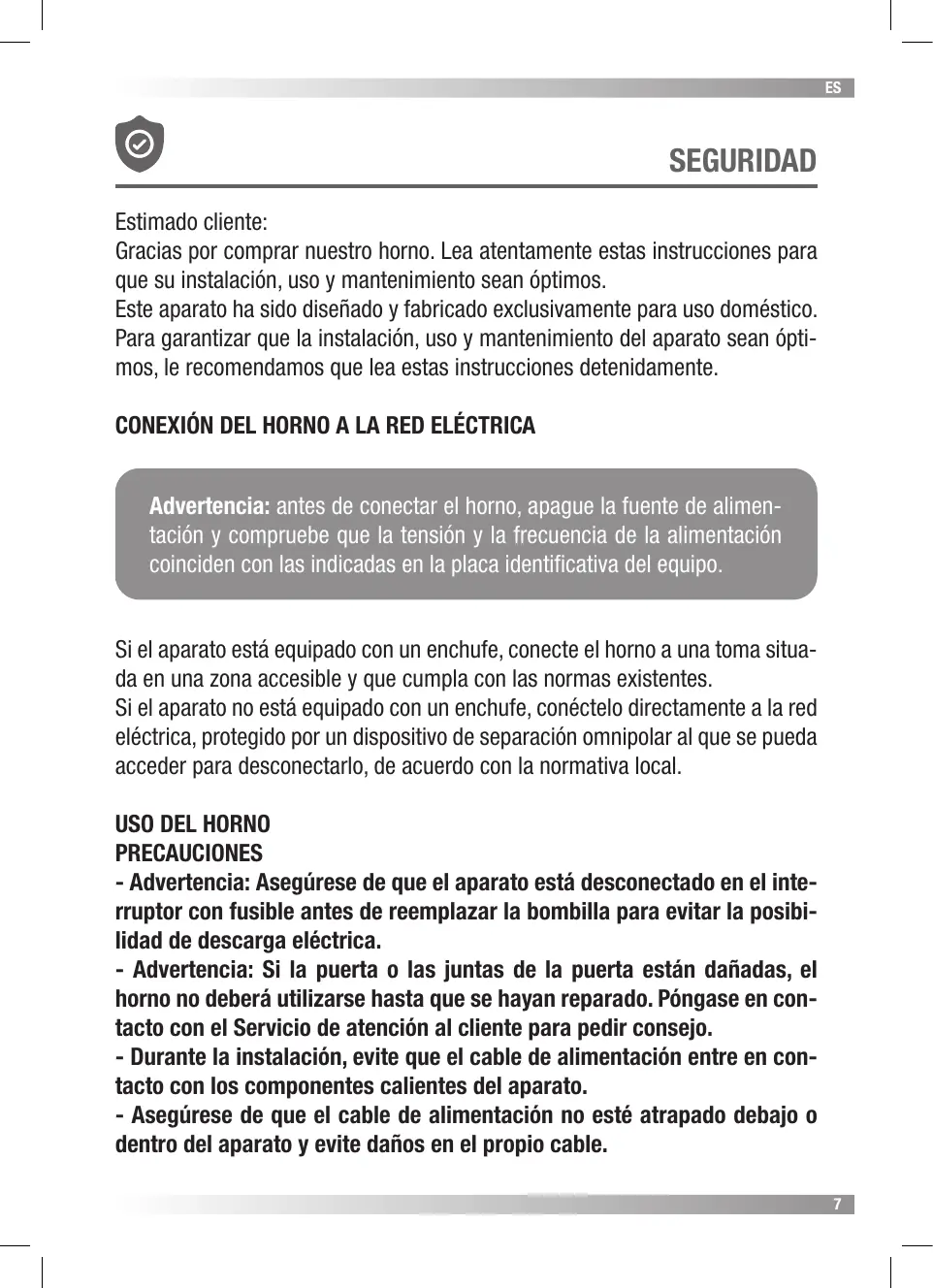 SEGURIDAD Estimado cliente: Gracias por comprar nuestro horno. Lea atentamente estas instrucciones para que su instalación, uso y mantenimiento sean óptimos. Este aparato ha sido diseñado y fabricado exclusivamente para uso doméstico. Para garantizar que la instalación, uso y mantenimiento del aparato sean óptimos, le recomendamos que lea estas instrucciones detenidamente. CONEXIÓN DEL HORNO A LA RED ELÉCTRICA Advertencia: antes de conectar el horno, apague la fuente de alimentación y compruebe que la tensión y la frecuencia de la alimentación coinciden con las indicadas en la placa identificativa del equipo. Si el aparato está equipado con un enchufe, conecte el horno a una toma situada en una zona accesible y que cumpla con las normas existentes. Si el aparato no está equipado con un enchufe, conéctelo directamente a la red eléctrica, protegido por un dispositivo de separación omnipolar al que se pueda acceder para desconectarlo, de acuerdo con la normativa local. USO DEL HORNO PRECAUCIONES - Advertencia: Asegúrese de que el aparato está desconectado en el interruptor con fusible antes de reemplazar la bombilla para evitar la posibilidad de descarga eléctrica. - Advertencia: Si la puerta o las juntas de la puerta están dañadas, el horno no deberá utilizarse hasta que se hayan reparado. Póngase en contacto con el Servicio de atención al cliente para pedir consejo. - Durante la instalación, evite que el cable de alimentación entre en contacto con los componentes calientes del aparato. - Asegúrese de que el cable de alimentación no esté atrapado debajo o dentro del aparato y evite daños en el propio cable. 7