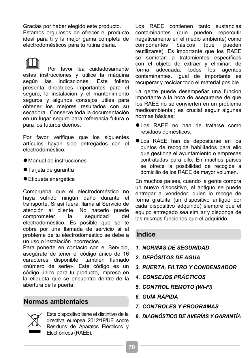 ALWAYS Please read thoroughly. this instruction book Gracias por haber elegido este producto. Estamos orgullosos de ofrecer el producto ideal para ti y la mejor gama completa de electrodomésticos para tu rutina diaria. Por favor lea cuidadosamente estas instrucciones y utilice la máquina según las indicaciones. Este folleto presenta directrices importantes para el seguro, la instalación y el mantenimiento seguros y algunos consejos útiles para obtener los mejores resultados con su secadora. Conserve toda la documentación en un lugar seguro para referencia futura o para los futuros dueños. Por favor verifique que los siguientes artículos hayan sido entregados con el electrodoméstico: Manual de instrucciones Tarjeta de garantía Etiqueta energética Comprueba que el electrodoméstico no haya sufrido ningún daño durante el transporte. Si así fuera, llama al Servicio de atención al cliente. No hacerlo puede comprometer seguridad del electrodoméstico. Es posible que se te cobre por una llamada de servicio si el problema de tu electrodoméstico se debe a un uso o instalación incorrectos. Para ponerte en contacto con el Servicio, asegúrate de tener el código único de 16 caracteres disponible, también llamado «número de serie». Este código es un código único para tu producto, impreso en la etiqueta que se encuentra dentro de la abertura de la puerta. Los RAEE contienen tanto sustancias contaminantes (que pueden repercutir negativamente en el medio ambiente) como componentes básicos (que pueden reutilizarse). Es importante que los RAEE se sometan a tratamientos específicos con el objeto de extraer y eliminar, de forma adecuada, todos los agentes contaminantes. Igual de importante es recuperar y reciclar todo el material posible. La gente puede desempeñar una función importante a la hora de asegurarse de que los RAEE no se convierten en un problema medioambiental; es crucial seguir algunas normas básicas: Los RAEE no han de tratarse como residuos domésticos. Los RAEE han de depositarse en los puntos de recogida habilitados para ello que gestiona el ayuntamiento o empresas contratadas para ello. En muchos países se ofrece la posibilidad de recogida a domicilio de los RAEE de mayor volumen. En muchos países, cuando la gente compra un nuevo dispositivo, el antiguo se puede entregar al vendedor, quien lo recoge de forma gratuita (un dispositivo antiguo por cada dispositivo adquirido) siempre que el equipo entregado sea similar y disponga de las mismas funciones que el adquirido. Índice