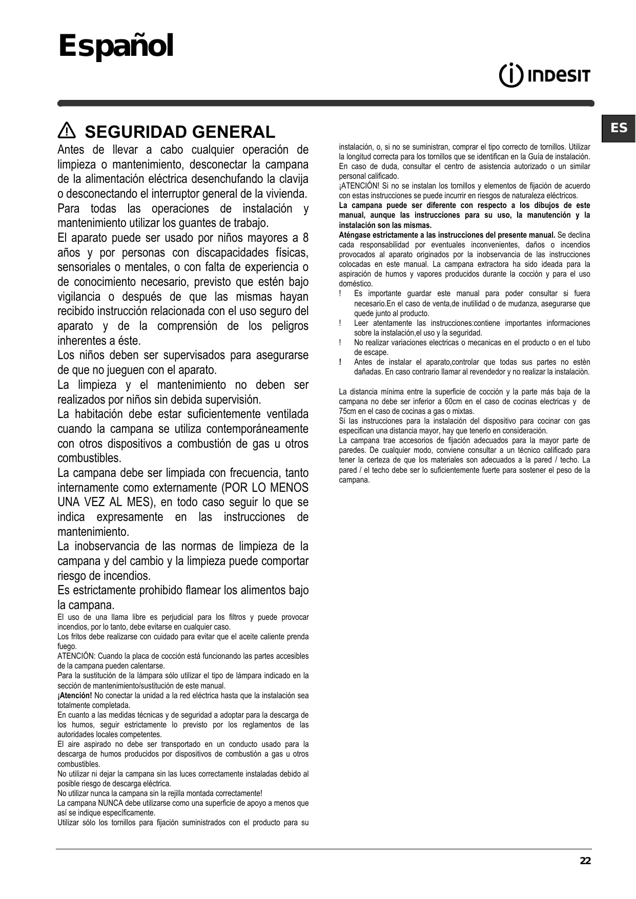 Los fritos debe realizarse con cuidado para evitar que el aceite caliente prenda fuego. ATENCIÓN: Cuando la placa de cocción está funcionando las partes accesibles de la campana pueden calentarse. Para la sustitución de la lámpara sólo utilizar el tipo de lámpara indicado en la sección de mantenimiento/sustitución de este manual. ¡Atención! No conectar la unidad a la red eléctrica hasta que la instalación sea totalmente completada. En cuanto a las medidas técnicas y de seguridad a adoptar para la descarga de los humos, seguir estrictamente lo previsto por los reglamentos de las autoridades locales competentes. El aire aspirado no debe ser transportado en un conducto usado para la descarga de humos producidos por dispositivos de combustión a gas u otros combustibles. No utilizar ni dejar la campana sin las luces correctamente instaladas debido al posible riesgo de descarga eléctrica. No utilizar nunca la campana sin la rejilla montada correctamente! La campana NUNCA debe utilizarse como una superficie de apoyo a menos que así se indique específicamente. Utilizar sólo los tornillos para fijación suministrados con el producto para su