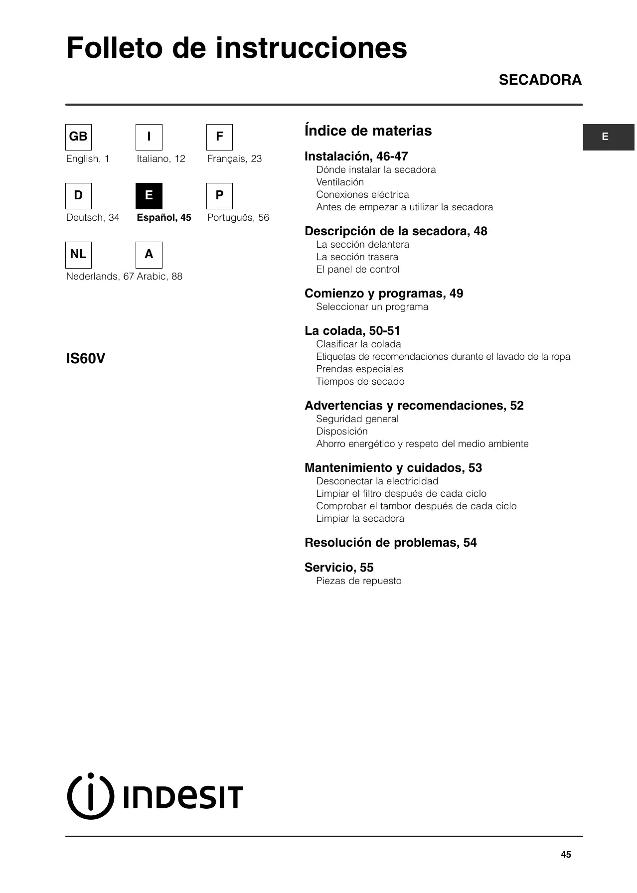 Nederlands, 67 Arabic, 88 La sección delantera La sección trasera El panel de control Comienzo y programas, 49 Seleccionar un programa La colada, 50-51 IS60V Clasificar la colada Etiquetas de recomendaciones durante el lavado de la ropa Prendas especiales Tiempos de secado Advertencias y recomendaciones, 52 Seguridad general Disposición Ahorro energético y respeto del medio ambiente Mantenimiento y cuidados, 53 Desconectar la electricidad Limpiar el filtro después de cada ciclo Comprobar el tambor después de cada ciclo Limpiar la secadora Resolución de problemas, 54 Servicio, 55 Piezas de repuesto