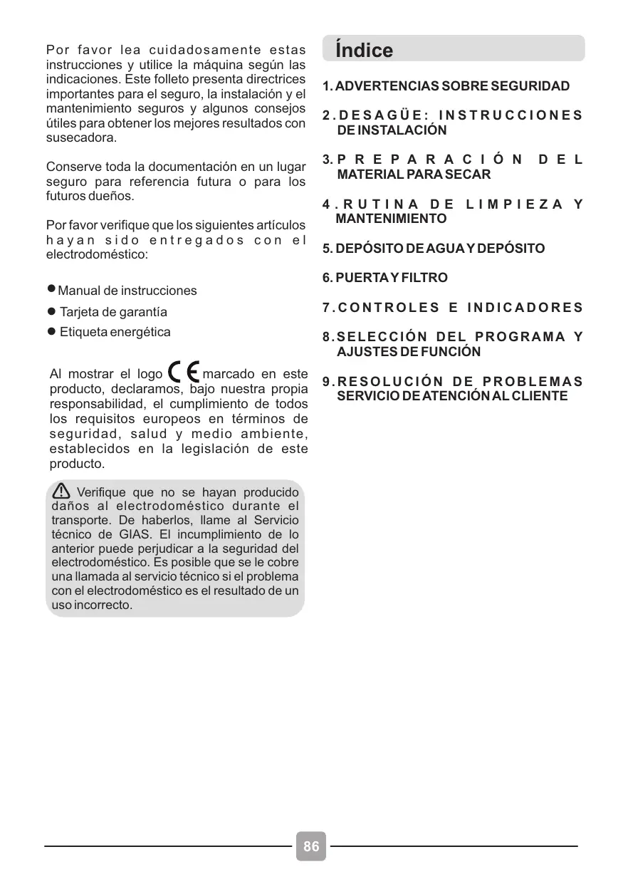 ● Apague la secadora y póngase en contacto con el Servicio técnico de GIAS para obtener asesoría. El nd cador está encend do… Hace falta limpiar el filtro? Está enroscada o tapada la manguera de ventilación? El nd cador está encend do… ● Hace falta sacar el agua del recipiente? SERVICIO DE ATENCIÓN AL CLIENTE Si después de realizar todas las comprobaciones recomendadas persistiera algún problema con la secadora, llame al Servicio GIAS de Atención al Cliente para obtener asesoramiento. Es posible que le puedan asesorar por teléfono o bien convenir una hora apropiada para que le visite un técn co bajo los términos de la garantía. Sin embargo, es posible que se le cobre si alguna de las situaciones siguientes es aplicable a su máquina: ● Si se halla en buen estado de funcionamiento. ● Si no se ha realizado la instalación de acuerdo a las instrucciones. ● Si se ha usado incorrectamente.