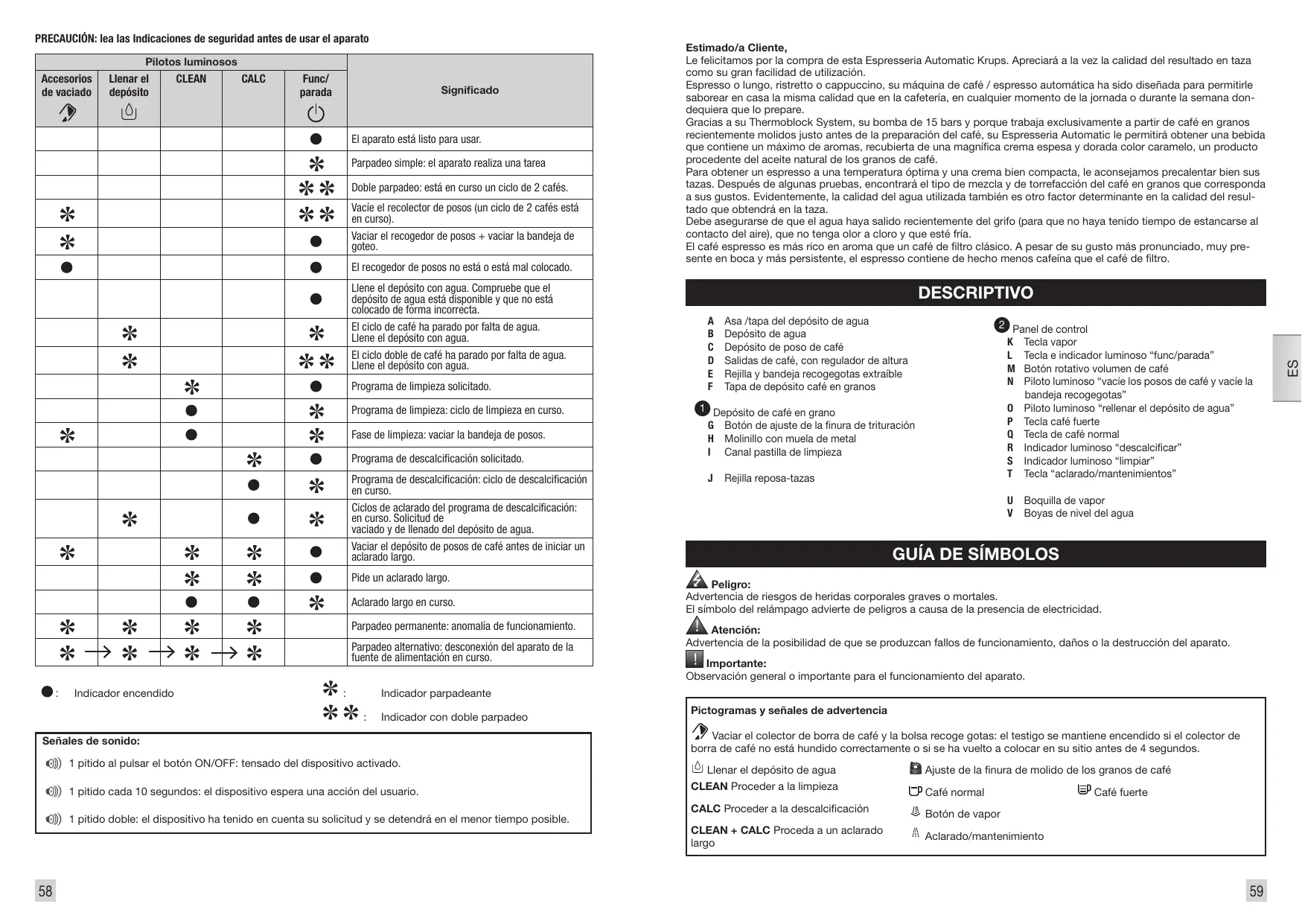 Estimado/a Cliente, Le felicitamos por la compra de esta Espresseria Automatic Krups. Apreciará a la vez la calidad del resultado en taza como su gran facilidad de utilización. Espresso o lungo, ristretto o cappuccino, su máquina de café / espresso automática ha sido diseñada para permitirle saborear en casa la misma calidad que en la cafetería, en cualquier momento de la jornada o durante la semana dondequiera que lo prepare. Gracias a su Thermoblock System, su bomba de 15 bars y porque trabaja exclusivamente a partir de café en granos recientemente molidos justo antes de la preparación del café, su Espresseria Automatic le permitirá obtener una bebida que contiene un máximo de aromas, recubierta de una magnífica crema espesa y dorada color caramelo, un producto procedente del aceite natural de los granos de café. Para obtener un espresso a una temperatura óptima y una crema bien compacta, le aconsejamos precalentar bien sus tazas. Después de algunas pruebas, encontrará el tipo de mezcla y de torrefacción del café en granos que corresponda a sus gustos. Evidentemente, la calidad del agua utilizada también es otro factor determinante en la calidad del resultado que obtendrá en la taza. Debe asegurarse de que el agua haya salido recientemente del grifo (para que no haya tenido tiempo de estancarse al contacto del aire), que no tenga olor a cloro y que esté fría. El café espresso es más rico en aroma que un café de filtro clásico. A pesar de su gusto más pronunciado, muy presente en boca y más persistente, el espresso contiene de hecho menos cafeína que el café de filtro. Pictogramas y señales de advertencia Vaciar el colector de borra de café y la bolsa recoge gotas: el testigo se mantiene encendido si el colector de borra de café no está hundido correctamente o si se ha vuelto a colocar en su sitio antes de 4 segundos. Llenar el depósito de agua Ajuste de la finura de molido de los granos de café CLEAN Proceder a la limpieza Café normal CALC Proceder a la descalcificación Botón de vapor CLEAN + CALC Proceda a un aclarado largo Aclarado/mantenimiento Café fuerte