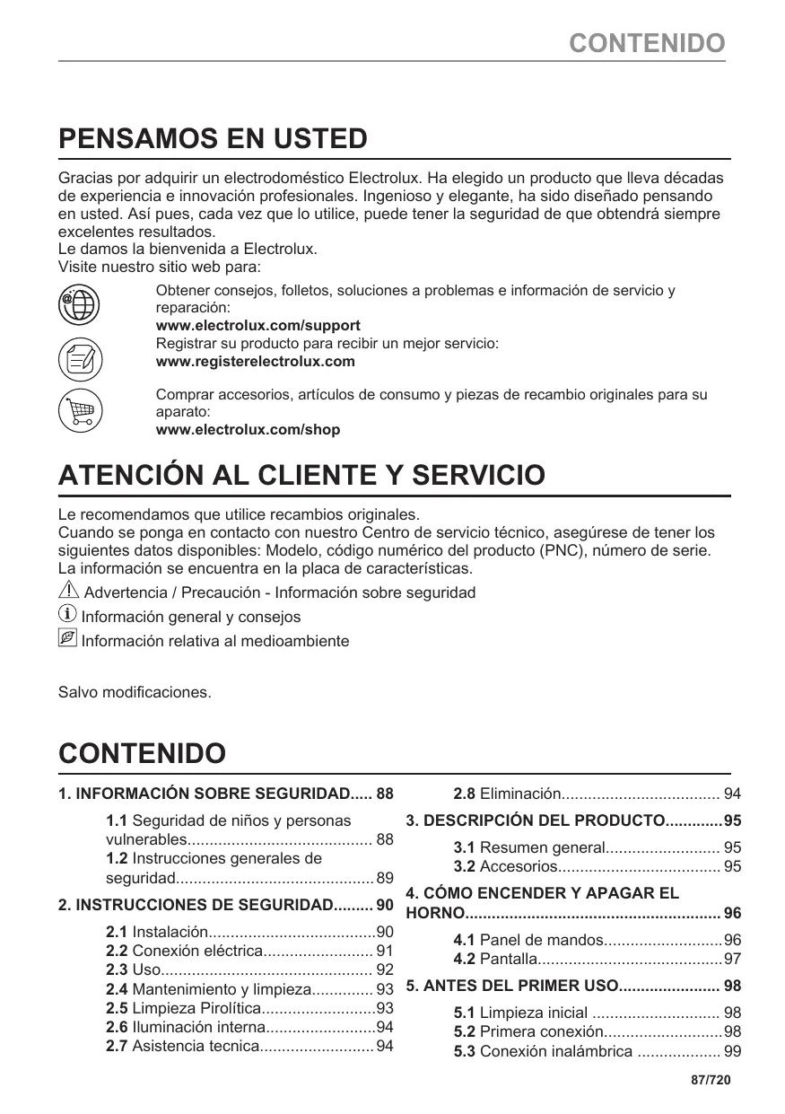 3. DESCRIPCIÓN DEL PRODUCTO95 vulnerables 88 3.1 Resumen general 95 1.2 Instrucciones generales de 3.2 Accesorios 95 seguridad 89 4. CÓMO ENCENDER Y APAGAR EL 2. INSTRUCCIONES DE SEGURIDAD 90 HORNO 96 2.1 Instalación90 4.1 Panel de mandos96 2.2 Conexión eléctrica 91 4.2 Pantalla97 2.3 Uso 92 2.4 Mantenimiento y limpieza 93 5. ANTES DEL PRIMER USO 98 2.5 Limpieza Pirolítica93 5.1 Limpieza inicial 98 2.6 Iluminación interna94 5.2 Primera conexión98 2.7 Asistencia tecnica 94 5.3 Conexión inalámbrica 99 87/720
