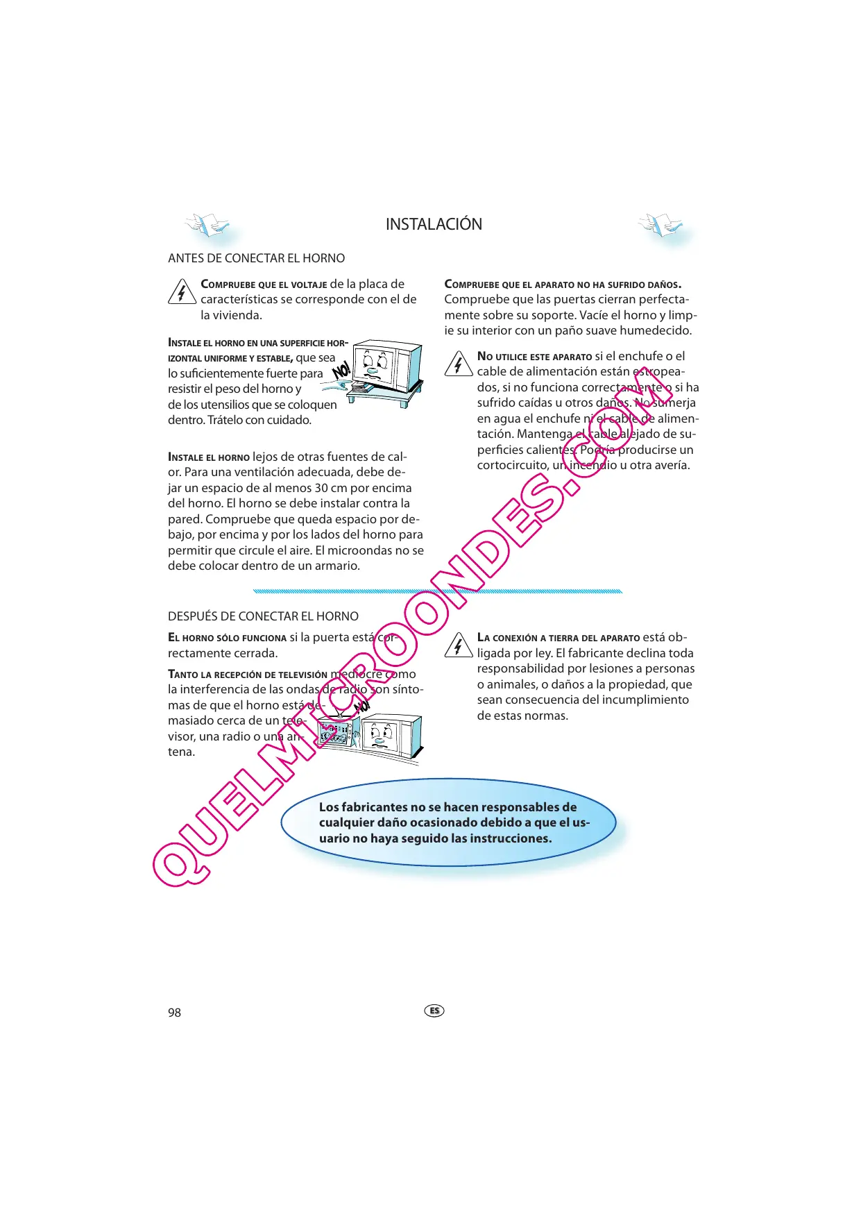 ES INSTRUCCIONES DE SEGURIDAD IMPORTANTES LÉALAS ATENTAMENTE Y GUÁRDELAS PARA CONSULTARLAS MÁS ADELANTE SI ES NECESARIO NO CALIENTE NI UTILICE MATERIAL INFLAMABLEEN el horno ni cerca de él. Los gases pueden provocar incendios o explosiones.