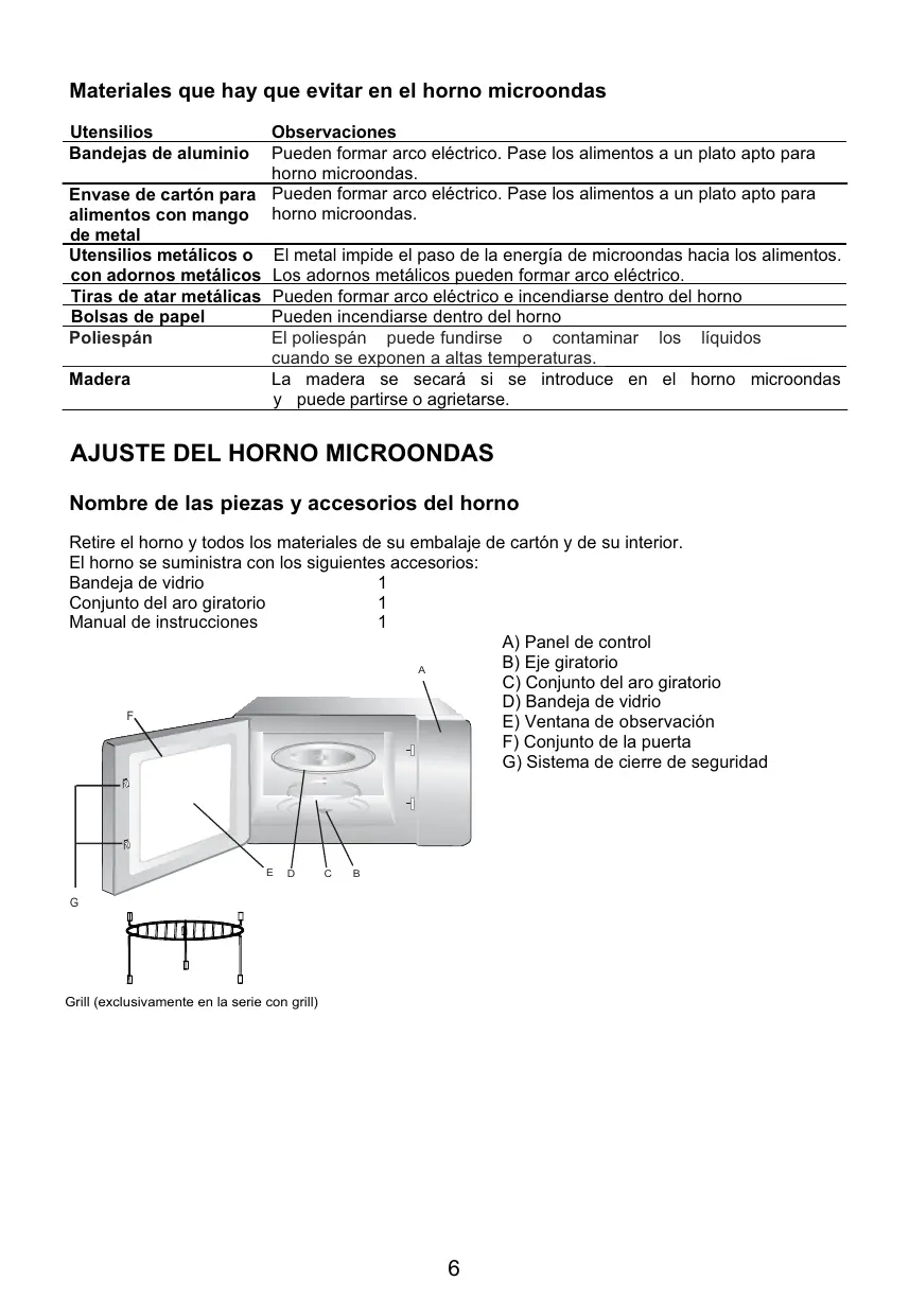 Nombre de las piezas y accesorios del horno Retire el horno y todos los materiales de su embalaje de cartón y de su interior. El horno se suministra con los siguientes accesorios: Bandeja de vidrio Conjunto del aro giratorio Manual de instrucciones A) Panel de control B) Eje giratorio C) Conjunto del aro giratorio D) Bandeja de vidrio E) Ventana de observación F) Conjunto de la puerta G) Sistema de cierre de seguridad