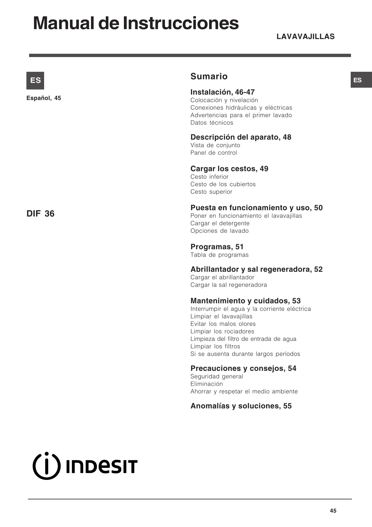 D 36A - INDESIT - Manual de uso y guía de instrucciones gratis