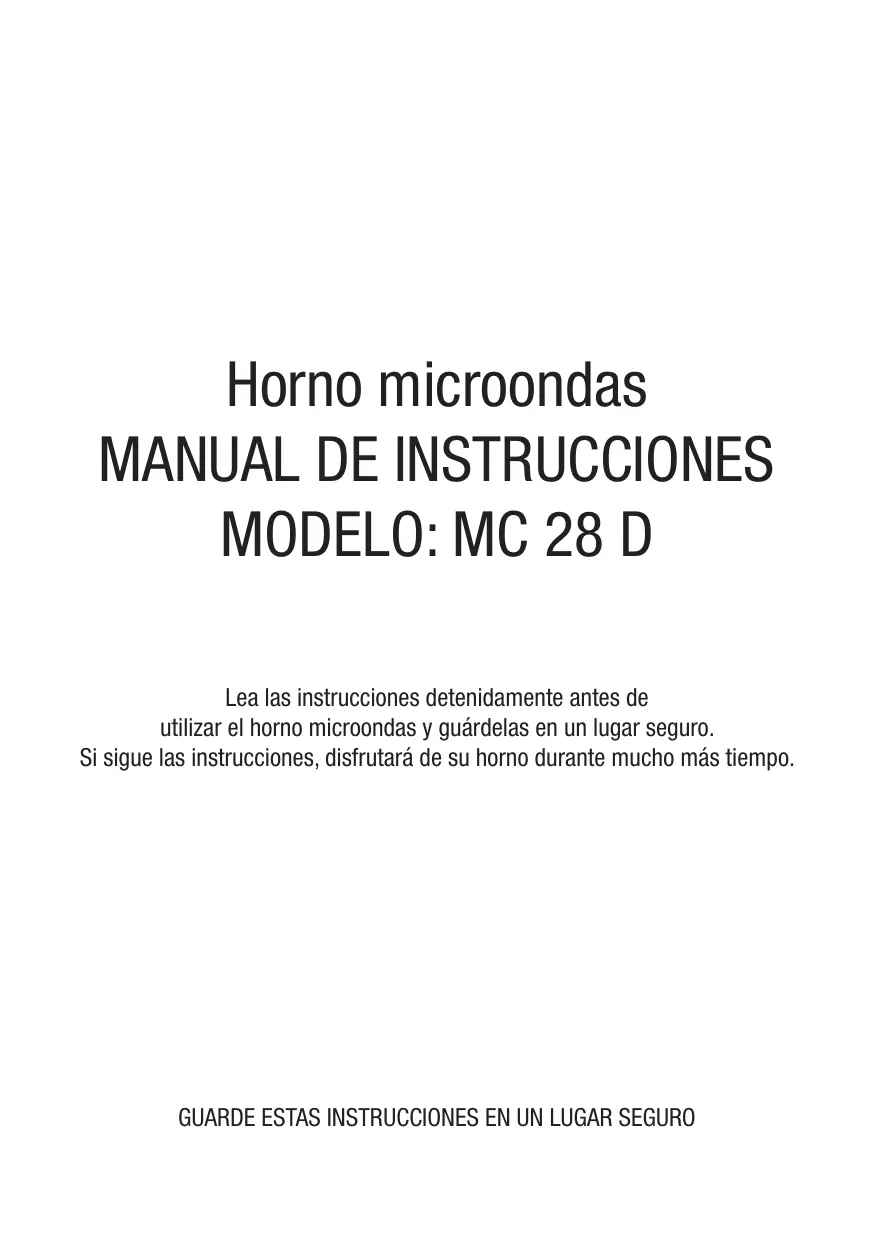 MANUAL DE INSTRUCCIONES MODELO: MC 28 D Lea las instrucciones detenidamente antes de utilizar el horno microondas y guárdelas en un lugar seguro. Si sigue las instrucciones, disfrutará de su horno durante mucho más tiempo.