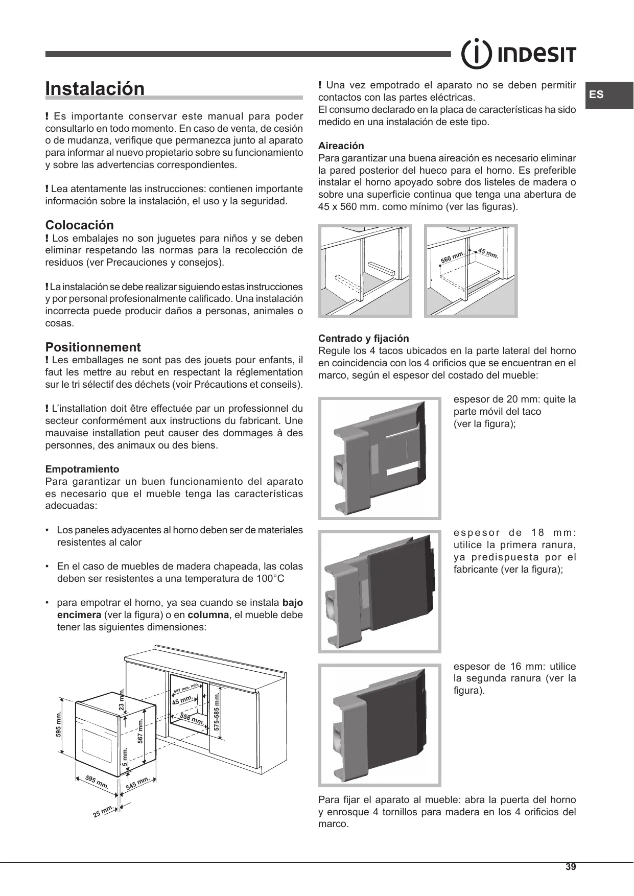 El consumo declarado en la placa de características ha sido medido en una instalación de este tipo. Aireación Para garantizar una buena aireación es necesario eliminar la pared posterior del hueco para el horno. Es preferible instalar el horno apoyado sobre dos listeles de madera o sobre una superficie continua que tenga una abertura de 45 x 560 mm. como mínimo (ver las figuras).