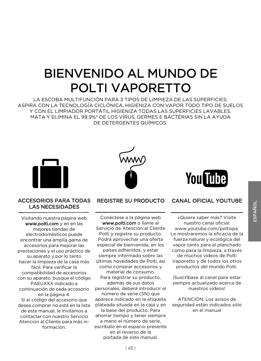 LAS NECESIDADES Visitando nuestra página web www.polti.com y en en las mejores tiendas de electrodomésticos puede encontrar una amplia gama de accesorios para mejorar las prestaciones y el uso práctico de su aparato y por lo tanto hacer la limpieza de la casa más fácil. Para verificar la compatibilidad de accesorios con su aparato, busque el código PAEUXXX indicado a continuación de cada accesorio en la página 4. Si el código del accesorio que desea comprar no está en la lista de este manual, le invitamos a contactar con nuestro Servicio Atencion al Cliente para más información. Conéctese a la página web ¿Quiere saber más? Visite www.polti.com o llame al nuestro canal oficial: Servicio de Atención al Cliente www.youtube.com/poltispa. Polti y registre su producto. Le mostraremos la eficacia de la Podrá aprovechar una oferta fuerza natural y ecológica del especial de bienvenida, en los vapor tanto para el planchado países adheridos, y estar como para la limpieza, a través siempre informado sobre las de muchos vídeos de Polti últimas novedades de Polti, así Vaporetto y de todos los otros como comprar accesorios y productos del mundo Polti. material de consumo. Para registrar su producto, ¡Suscríbase al canal para estar además de sus datos siempre actualizado acerca de personales, deberá introducir el nuestros vídeos! número de serie (SN) que aparece indicado en la etiqueta ATENCION: Los avisos de plateada situada en la caja y en seguridad están indicados sólo la base del producto. Para en el manual ahorrar tiempo y tener siempre a mano el número de serie, escríbalo en el espacio presente en el reverso de la portada de este manual. | 45 | ESPAÑOL LA ESCOBA MULTIFUNCIÓN PARA 3 TIPOS DE LIMPIEZA DE LAS SUPERFICIES: ASPIRA CON LA TECNOLOGÍA CICLÓNICA, HIGIENIZA CON VAPOR TODO TIPO DE SUELOS Y CON EL LIMPIADOR PORTÁTIL HIGIENIZA TODAS LAS SUPERFICIES LAVABLES. MATA Y ELIMINA EL 99,9%* DE LOS VÍRUS, GERMES E BACTÉRIAS SIN LA AYUDA DE DETERGENTES QUÍMICOS.