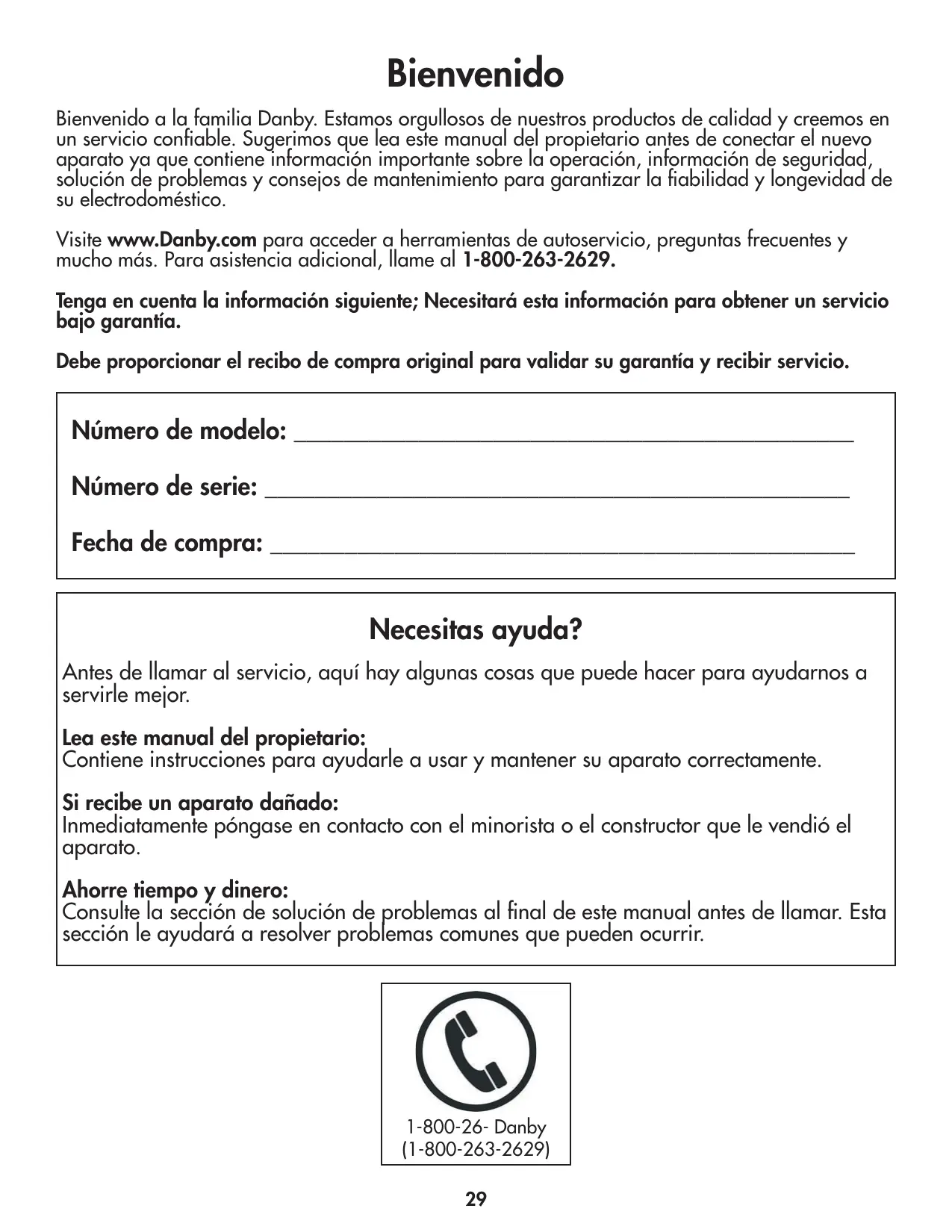 Bienvenido Bienvenido a la familia Danby. Estamos orgullosos de nuestros productos de calidad y creemos en un servicio confiable. Sugerimos que lea este manual del propietario antes de conectar el nuevo aparato ya que contiene información importante sobre la operación, información de seguridad, solución de problemas y consejos de mantenimiento para garantizar la fiabilidad y longevidad de su electrodoméstico. Visite www.Danby.com para acceder a herramientas de autoservicio, preguntas frecuentes y mucho más. Para asistencia adicional, llame al 1-800-263-2629. Tenga en cuenta la información siguiente; Necesitará esta información para obtener un servicio bajo garantía. Debe proporcionar el recibo de compra original para validar su garantía y recibir servicio. Número de modelo: _____________________________________________ Número de serie: _______________________________________________ Fecha de compra: _______________________________________________ Necesitas ayuda? Antes de llamar al servicio, aquí hay algunas cosas que puede hacer para ayudarnos a servirle mejor. Lea este manual del propietario: Contiene instrucciones para ayudarle a usar y mantener su aparato correctamente. Si recibe un aparato dañado: Inmediatamente póngase en contacto con el minorista o el constructor que le vendió el aparato. Ahorre tiempo y dinero: Consulte la sección de solución de problemas al final de este manual antes de llamar. Esta sección le ayudará a resolver problemas comunes que pueden ocurrir. 1-800-26- Danby (1-800-263-2629)