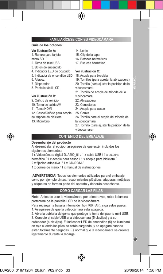 Al desembalar el equipo, asegúrese de que estén incluidos los siguientes elementos: 1 x Videocámara digital DJA200_01 / 1 x cable USB / 1 x estuche hermético / 1 x acople para casco / 1 x acople para bicicleta / 2 x fijación adhesiva / 1 x CD-ROM / 1 x correa de mano / 1 x manual de instrucciones ¡ADVERTENCIA! Todos los elementos utilizados para el embalaje, como por ejemplo cintas, recubrimientos plásticos, ataduras metálicas y etiquetas no forman parte del aparato y deberán desecharse.