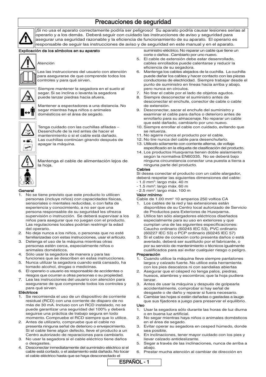 Precauciones de seguridad ¡Si no usa el aparato correctamente podría ser peligroso! Su aparato podría causar lesiones serias al operario y a los demás. Deberá seguir con cuidado las instrucciones de aviso y seguridad para asegurar una seguridad razonable y la eficiencia de funcionamiento de su aparato. El operario es responsable de seguir las instrucciones de aviso y de seguridad en este manual y en el aparato. Explicación de los símbolos en su aparato Atención Lea las instrucciones del usuario con atención para asegurarse de que comprende todos los controles y para qué sirven. Siempre mantener la segadora en el suelo al segar. Si se inclina o levanta la segadora puede lanzar piedras hacia afuera. Mantener a espectadores a una distancia. No segar mientras haya niños o animales domésticos en el área de segado. Tenga cuidado con las cuchillas afiladas – Desenchufe de la red antes de hacer el mantenimiento o si el cable está dañado. Las cuchillas continúan girando después de apagar la máquina. Mantenga el cable de alimentación lejos de la hoja. General