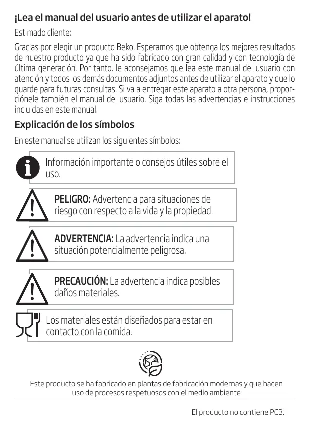¡Lea el manual del usuario antes de utilizar el aparato! Estimado cliente: Gracias por elegir un producto Beko. Esperamos que obtenga los mejores resultados de nuestro producto ya que ha sido fabricado con gran calidad y con tecnología de última generación. Por tanto, le aconsejamos que lea este manual del usuario con atención y todos los demás documentos adjuntos antes de utilizar el aparato y que lo guarde para futuras consultas. Si va a entregar este aparato a otra persona, proporciónele también el manual del usuario. Siga todas las advertencias e instrucciones incluidas en este manual. Explicación de los símbolos En este manual se utilizan los siguientes símbolos: