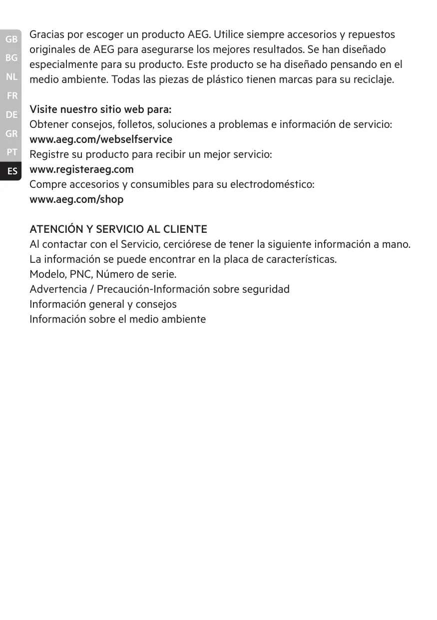 Visite nuestro sitio web para: Obtener consejos, folletos, soluciones a problemas e información de servicio: www.aeg.com/webselfservice Registre su producto para recibir un mejor servicio: www.registeraeg.com Compre accesorios y consumibles para su electrodoméstico: www.aeg.com/shop