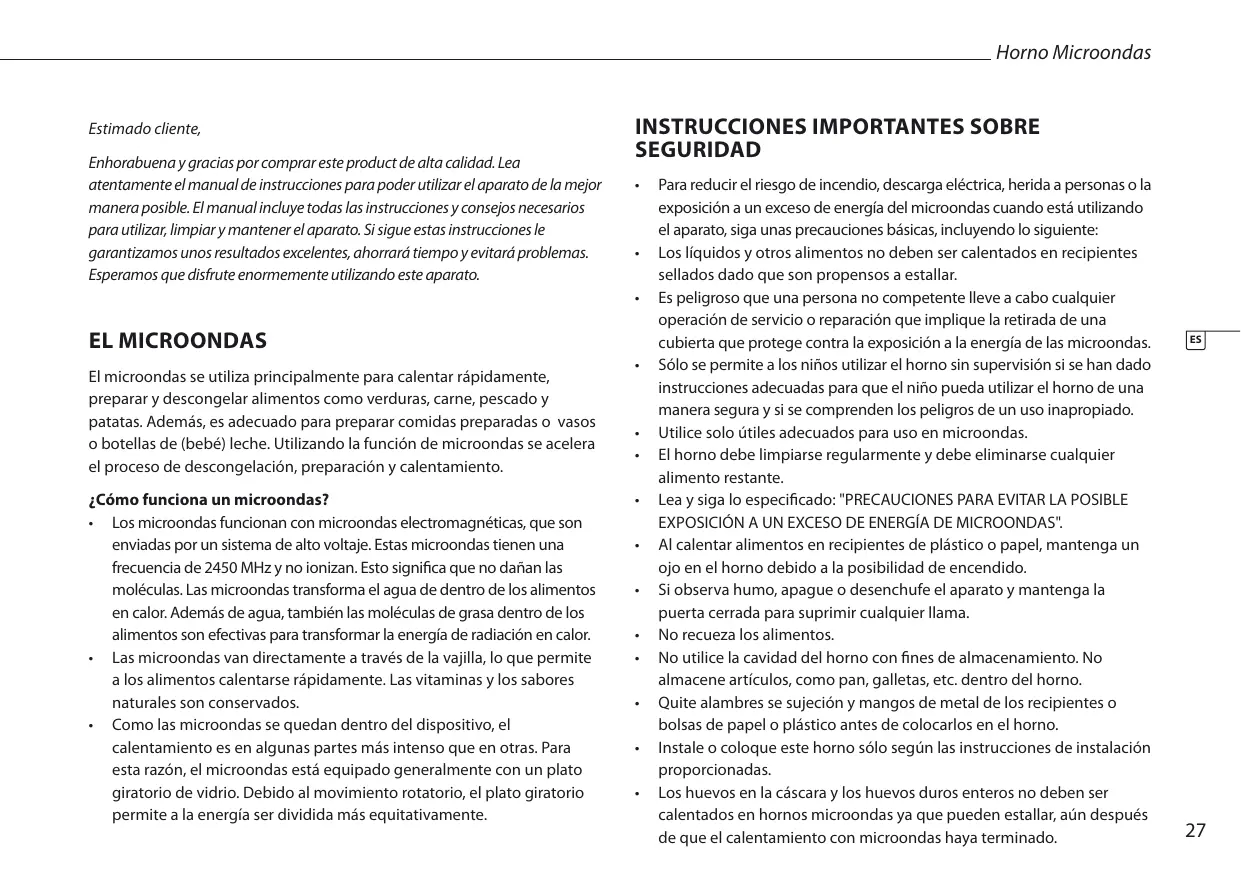 - Para reducir el riesgo de incendio, descarga electrica, herida a personas o la exposión a un excesso de energia del microondas cuando está utilizando el aparato, sigaunas precauciones bássicas, incluyendo lo suiviente:
