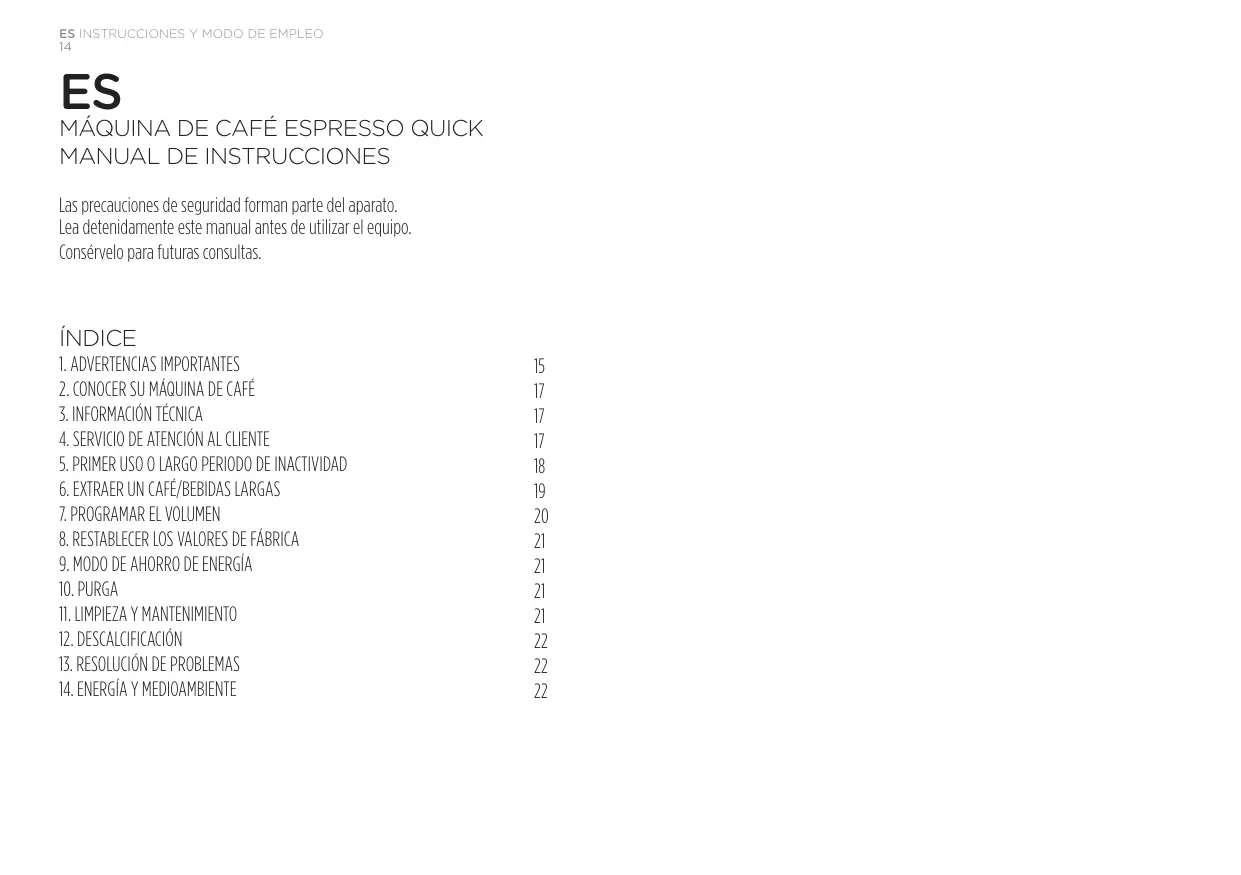1. ADVERTENCIAS IMPORTANTES 2. CONOCER SU MÁQUINA DE CAFÉ 3. INFORMACIÓN TÉCNICA 4. SERVICIO DE ATENCIÓN AL CLIENTE 5. PRIMER USO O LARGO PERIODO DE INACTIVIDAD 6. EXTRAER UN CAFÉ/BEBIDAS LARGAS 7. PROGRAMAR EL VOLUMEN 8. RESTABLECER LOS VALORES DE FÁBRICA 9. MODO DE AHORRO DE ENERGÍA 10. PURGA 11. LIMPIEZA Y MANTENIMIENTO 12. DESCALCIFICACIÓN 13. RESOLUCIÓN DE PROBLEMAS 14. ENERGÍA Y MEDIOAMBIENTE