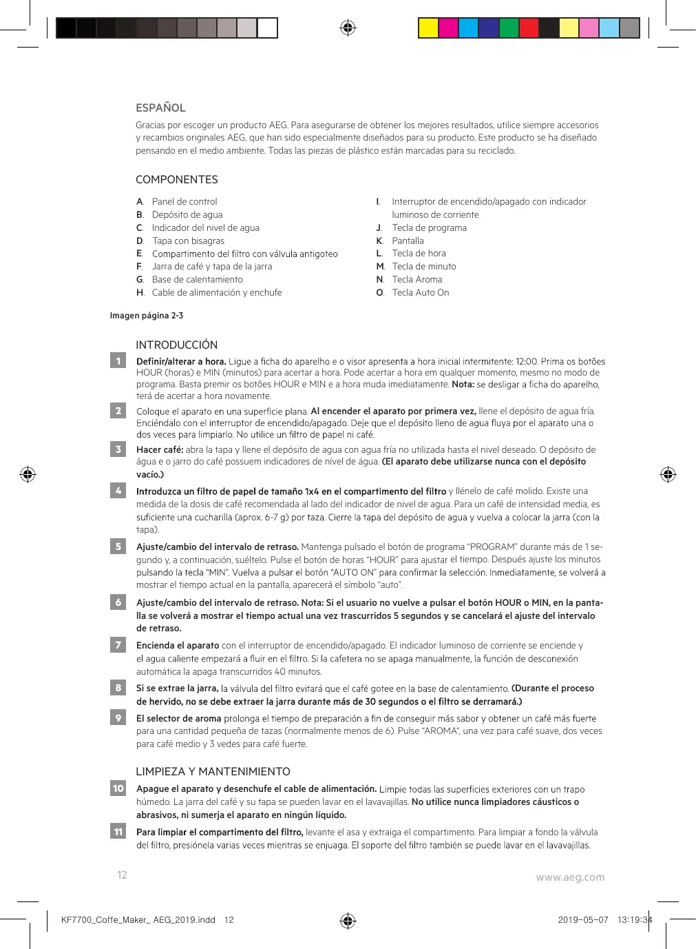 • Nunca utilice o coja el electrodoméstico si: – el cable de alimentación presenta daños, – la carcasa está dañada. www.aeg.com KF7700_Coffe_Maker_ AEG_2019.indd 13