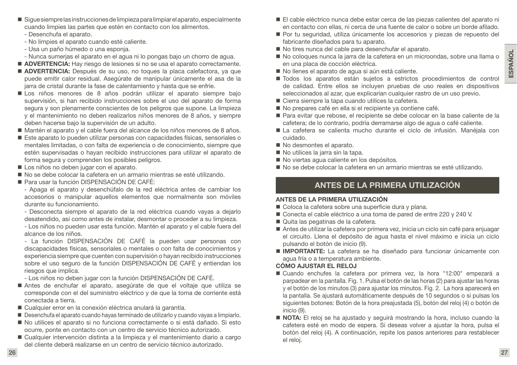 Coloca la cafetera sobre una superficie dura y plana. Conecta el cable eléctrico a una toma de pared de entre 220 y 240 V. Quita las pegatinas de la cafetera. Antes de utilizar la cafetera por primera vez, inicia un ciclo sin café para enjuagar el circuito. Llena el depósito de agua hasta el nivel máximo e inicia un ciclo pulsando el botón de inicio (9). IMPORTANTE: La cafetera se ha diseñado para funcionar únicamente con agua fría o a temperatura ambiente. CÓMO AJUSTAR EL RELOJ Cuando enchufes la cafetera por primera vez, la hora "12:00" empezará a parpadear en la pantalla. Fig. 1. Pulsa el botón de las horas (2) para ajustar las horas y el botón de los minutos (3) para ajustar los minutos. Fig. 2. La hora aparecerá en la pantalla. Se ajustará automáticamente después de 10 segundos o si pulsas los siguientes botones: Botón de la hora preajustada (5), botón del reloj (4) o botón de inicio (9). NOTA: El reloj se ha ajustado y seguirá mostrando la hora, incluso cuando la cafetera esté en modo de espera. Si deseas volver a ajustar la hora, pulsa el botón del reloj (4). A continuación, repite los pasos anteriores para restablecer el reloj. 27