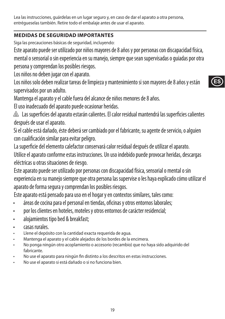 Los niños no deben jugar con el aparato. Los niños solo deben realizar tareas de limpieza y mantenimiento si son mayores de 8 años y están supervisados por un adulto. Mantenga el aparato y el cable fuera del alcance de niños menores de 8 años. El uso inadecuado del aparato puede ocasionar heridas. h Las superficies del aparato estarán calientes. El calor residual mantendrá las superficies calientes después de usar el aparato. Si el cable está dañado, éste deberá ser cambiado por el fabricante, su agente de servicio, o alguien con cualificación similar para evitar peligro. La superficie del elemento calefactor conservará calor residual después de utilizar el aparato. Utilice el aparato conforme estas instrucciones. Un uso indebido puede provocar heridas, descargas eléctricas u otras situaciones de riesgo. Este aparato puede ser utilizado por personas con discapacidad física, sensorial o mental o sin experiencia en su manejo siempre que otra persona las supervise o les haya explicado cómo utilizar el aparato de forma segura y comprendan los posibles riesgos. Este aparato está pensado para uso en el hogar y en contextos similares, tales como: • áreas de cocina para el personal en tiendas, oficinas y otros entornos laborales; • por los clientes en hoteles, moteles y otros entornos de carácter residencial; • alojamientos tipo bed & breakfast; • casas rurales. • • • • •