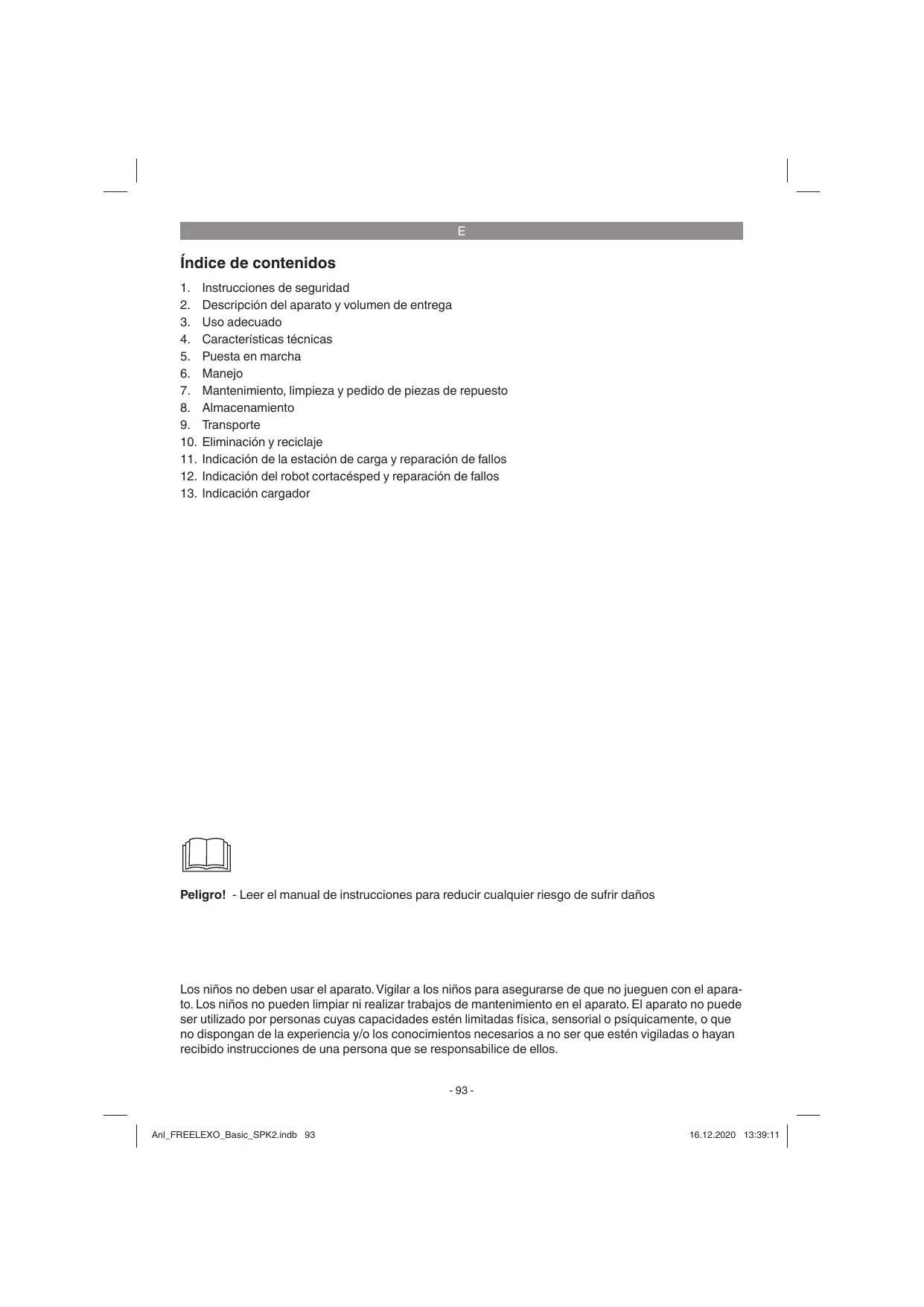 Descripción del aparato y volumen de entrega Uso adecuado Características técnicas Puesta en marcha Manejo Mantenimiento, limpieza y pedido de piezas de repuesto Almacenamiento Transporte Eliminación y reciclaje Indicación de la estación de carga y reparación de fallos Indicación del robot cortacésped y reparación de fallos Indicación cargador