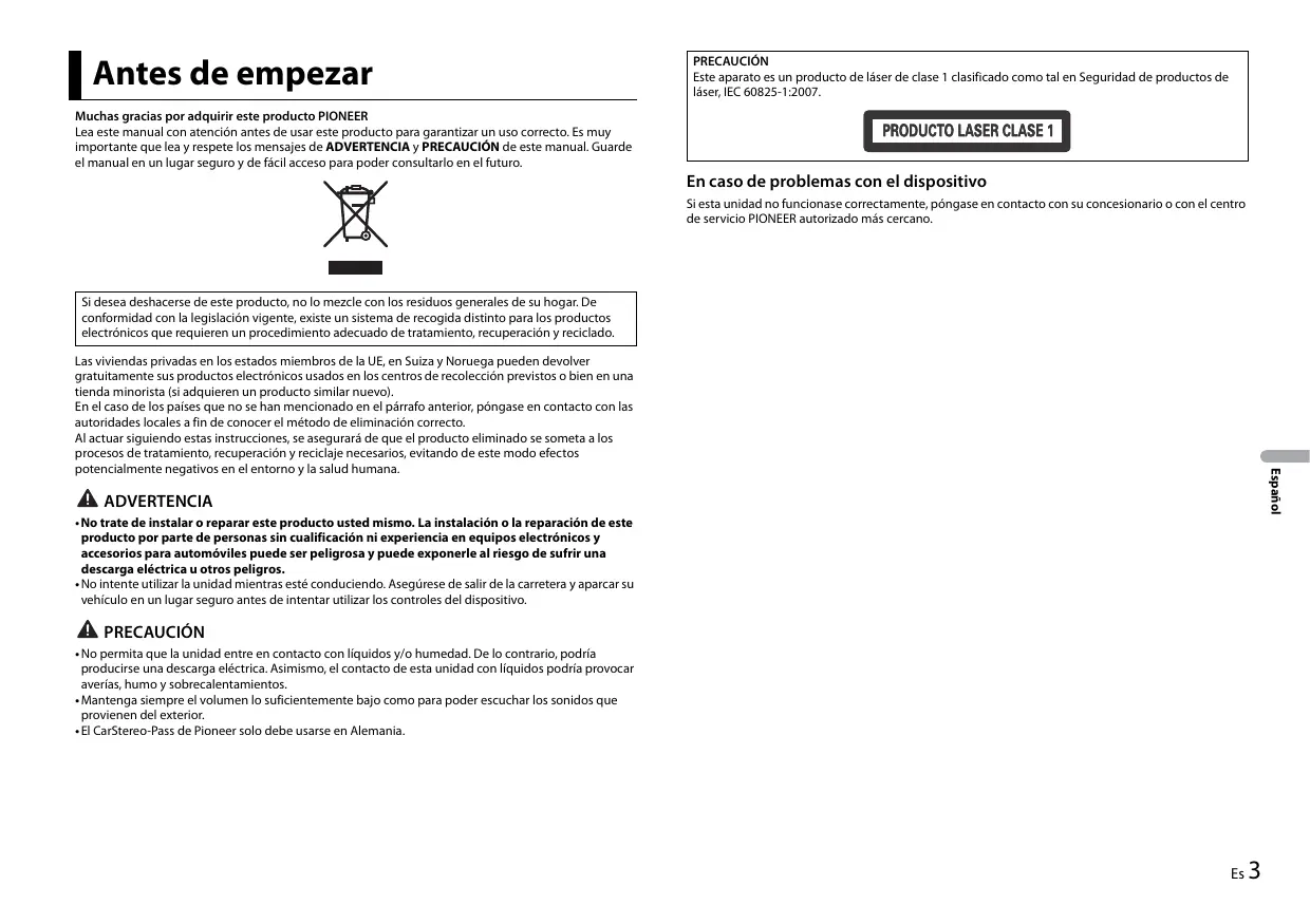 • No permita que la unidad entre en contacto con líquidos y/o humedad. De lo contrario, podría producirse una descarga eléctrica. Asimismo, el contacto de esta unidad con líquidos podría provocar averías, humo y sobrecalentamientos. • Mantenga siempre el volumen lo suficientemente bajo como para poder escuchar los sonidos que provienen del exterior. • El CarStereo-Pass de Pioneer solo debe usarse en Alemania.
