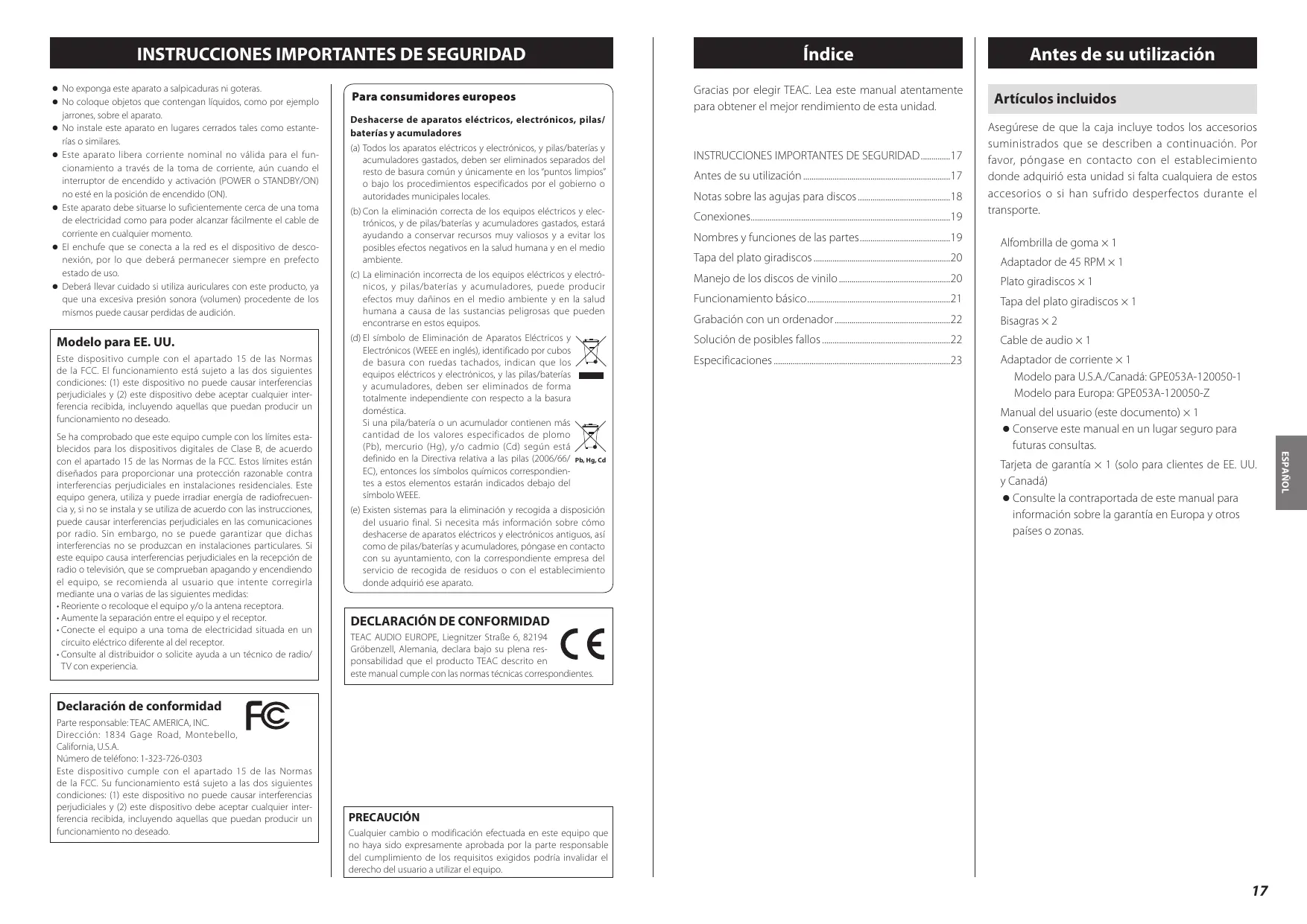 Parte responsable: TEAC AMERICA, INC. Dirección: 1834 Gage Road, Montebello, California, U.S.A. Número de teléfono: 1-323-726-0303 Este dispositivo cumple con el apartado 15 de las Normas de la FCC. Su funcionamiento está sujeto a las dos siguientes condiciones: (1) este dispositivo no puede causar interferencias perjudiciales y (2) este dispositivo debe aceptar cualquier interferencia recibida, incluyendo aquellas que puedan producir un funcionamiento no deseado.