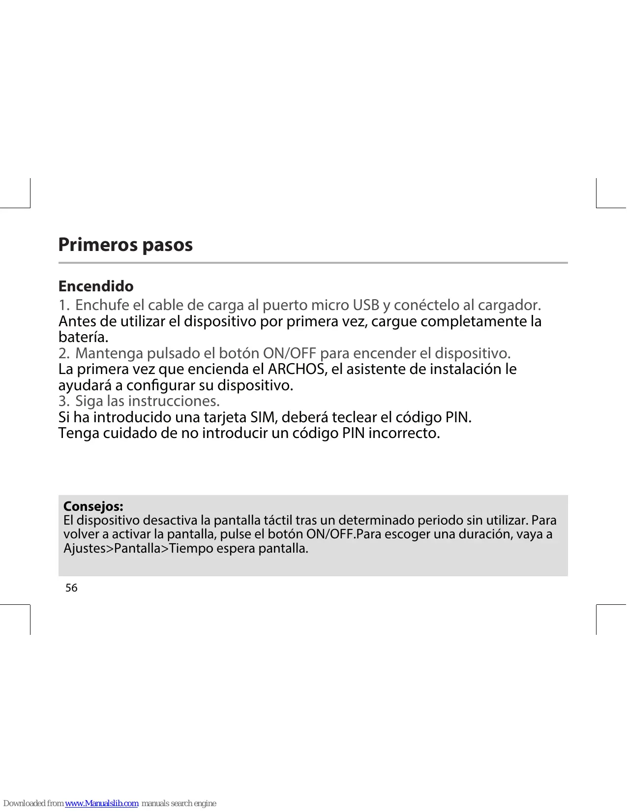 Encendido 1. Enchufe el cable de carga al puerto micro USB y conéctelo al cargador. Antes de utilizar el dispositivo por primera vez, cargue completamente la batería. 2. Mantenga pulsado el botón ON/OFF para encender el dispositivo. La primera vez que encienda el ARCHOS, el asistente de instalación le ayudará a configurar su dispositivo. 3. Siga las instrucciones. Si ha introducido una tarjeta SIM, deberá teclear el código PIN. Tenga cuidado de no introducir un código PIN incorrecto.