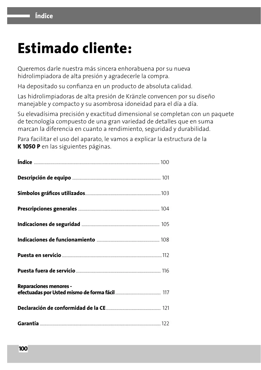 - Estimado cliente: Queremos darle nuestra más sincera enhorabuena por su nueva hidrolimpiadora de alta presión y agradecerle la compra. Ha depositado su confianza en un producto de absoluta calidad. Las hidrolimpiadoras de alta presión de Kränzle convencen por su diseño manejable y compacto y su asombrosa idoneidad para el día a día. Su elevadísima precisión y exactitud dimensional se completan con un paquete de tecnología compuesto de una gran variedad de detalles que en suma marcan la diferencia en cuanto a rendimiento, seguridad y durabilidad. Para facilitar el uso del aparato, le vamos a explicar la estructura de la K 1050 P en las siguientes páginas. Índice p. 100