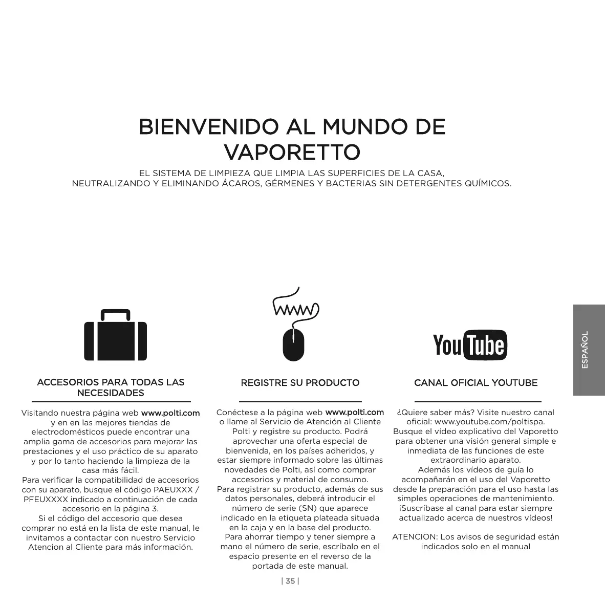 NECESIDADES Visitando nuestra página web www.polti.com y en en las mejores tiendas de electrodomésticos puede encontrar una amplia gama de accesorios para mejorar las prestaciones y el uso práctico de su aparato y por lo tanto haciendo la limpieza de la casa más fácil. Para verificar la compatibilidad de accesorios con su aparato, busque el código PAEUXXX / PFEUXXXX indicado a continuación de cada accesorio en la página 3. Si el código del accesorio que desea comprar no está en la lista de este manual, le invitamos a contactar con nuestro Servicio Atencion al Cliente para más información. Conéctese a la página web www.polti.com o llame al Servicio de Atención al Cliente Polti y registre su producto. Podrá aprovechar una oferta especial de bienvenida, en los países adheridos, y estar siempre informado sobre las últimas novedades de Polti, así como comprar accesorios y material de consumo. Para registrar su producto, además de sus datos personales, deberá introducir el número de serie (SN) que aparece indicado en la etiqueta plateada situada en la caja y en la base del producto. Para ahorrar tiempo y tener siempre a mano el número de serie, escríbalo en el espacio presente en el reverso de la portada de este manual. ¿Quiere saber más? Visite nuestro canal oficial: www.youtube.com/poltispa. Busque el vídeo explicativo del Vaporetto para obtener una visión general simple e inmediata de las funciones de este extraordinario aparato. Además los vídeos de guía lo acompañarán en el uso del Vaporetto desde la preparación para el uso hasta las simples operaciones de mantenimiento. ¡Suscríbase al canal para estar siempre actualizado acerca de nuestros vídeos! | 35 | ATENCION: Los avisos de seguridad están indicados solo en el manual