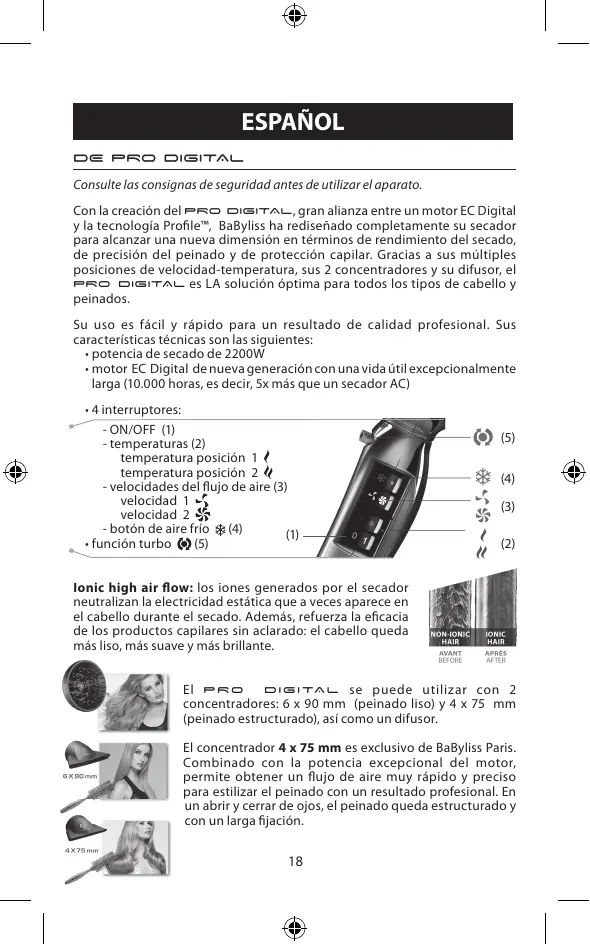 ESPAÑOL DE PRO DIGITAL Consulte las consignas de seguridad antes de utilizar el aparato. Con la creación del PRO DIGITAL, gran alianza entre un motor EC Digital y la tecnología Profile™, BaByliss ha rediseñado completamente su secador para alcanzar una nueva dimensión en términos de rendimiento del secado, de precisión del peinado y de protección capilar. Gracias a sus múltiples posiciones de velocidad-temperatura, sus 2 concentradores y su difusor, el PRO DIGITAL es LA solución óptima para todos los tipos de cabello y peinados. Su uso es fácil y rápido para un resultado de calidad profesional. Sus características técnicas son las siguientes: • potencia de secado de 2200W • motor EC Digital de nueva generación con una vida útil excepcionalmente larga (10.000 horas, es decir, 5x más que un secador AC) • 4 interruptores: - ON/OFF (1) - temperaturas (2) temperatura posición 1 temperatura posición 2 - velocidades del flujo de aire (3) velocidad 1 velocidad 2 - botón de aire frío (4) (1) • función turbo (5)