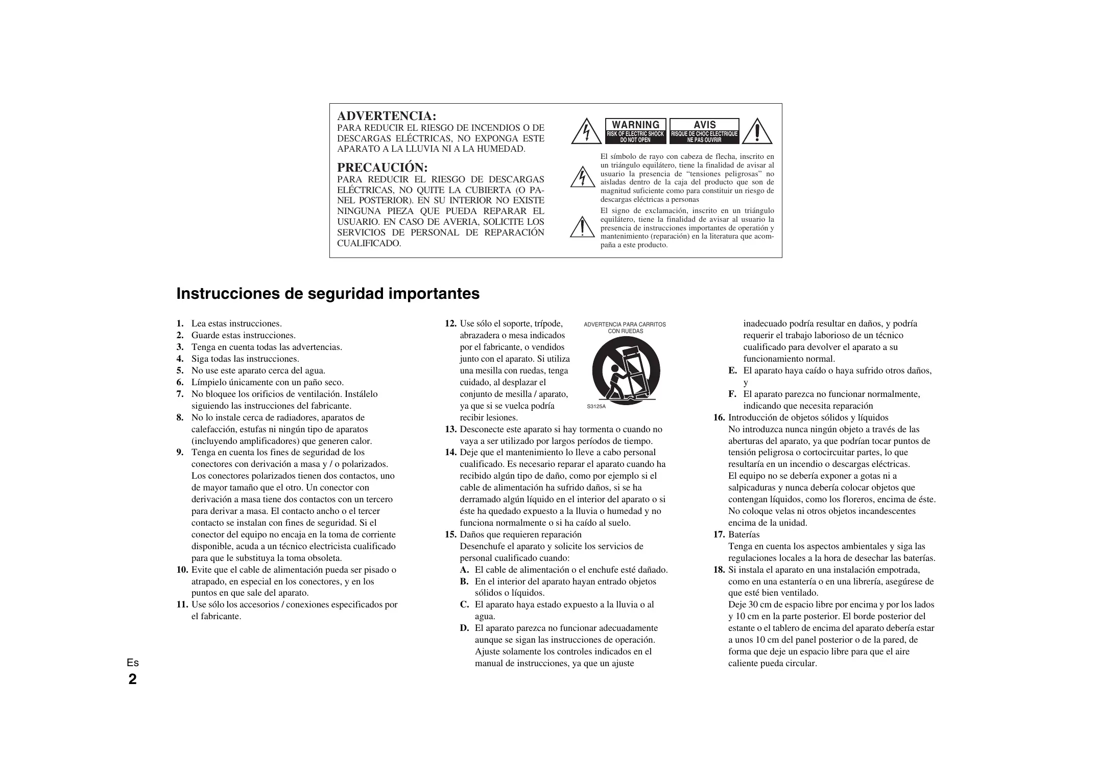 12. Use sólo el soporte, trípode, CON RUEDAS abrazadera o mesa indicados por el fabricante, o vendidos junto con el aparato. Si utiliza una mesilla con ruedas, tenga cuidado, al desplazar el conjunto de mesilla / aparato, S3125A ya que si se vuelca podría recibir lesiones. 13. Desconecte este aparato si hay tormenta o cuando no vaya a ser utilizado por largos períodos de tiempo. 14. Deje que el mantenimiento lo lleve a cabo personal cualificado. Es necesario reparar el aparato cuando ha recibido algún tipo de daño, como por ejemplo si el cable de alimentación ha sufrido daños, si se ha derramado algún líquido en el interior del aparato o si éste ha quedado expuesto a la lluvia o humedad y no funciona normalmente o si ha caído al suelo. 15. Daños que requieren reparación Desenchufe el aparato y solicite los servicios de personal cualificado cuando: A. El cable de alimentación o el enchufe esté dañado. B. En el interior del aparato hayan entrado objetos sólidos o líquidos. C. El aparato haya estado expuesto a la lluvia o al agua. D. El aparato parezca no funcionar adecuadamente aunque se sigan las instrucciones de operación. Ajuste solamente los controles indicados en el manual de instrucciones, ya que un ajuste