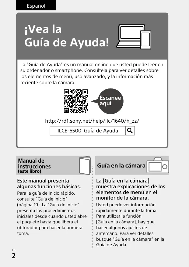 Guía de Ayuda! La “Guía de Ayuda” es un manual online que usted puede leer en su ordenador o smartphone. Consúltela para ver detalles sobre los elementos de menú, uso avanzado, y la información más reciente sobre la cámara.