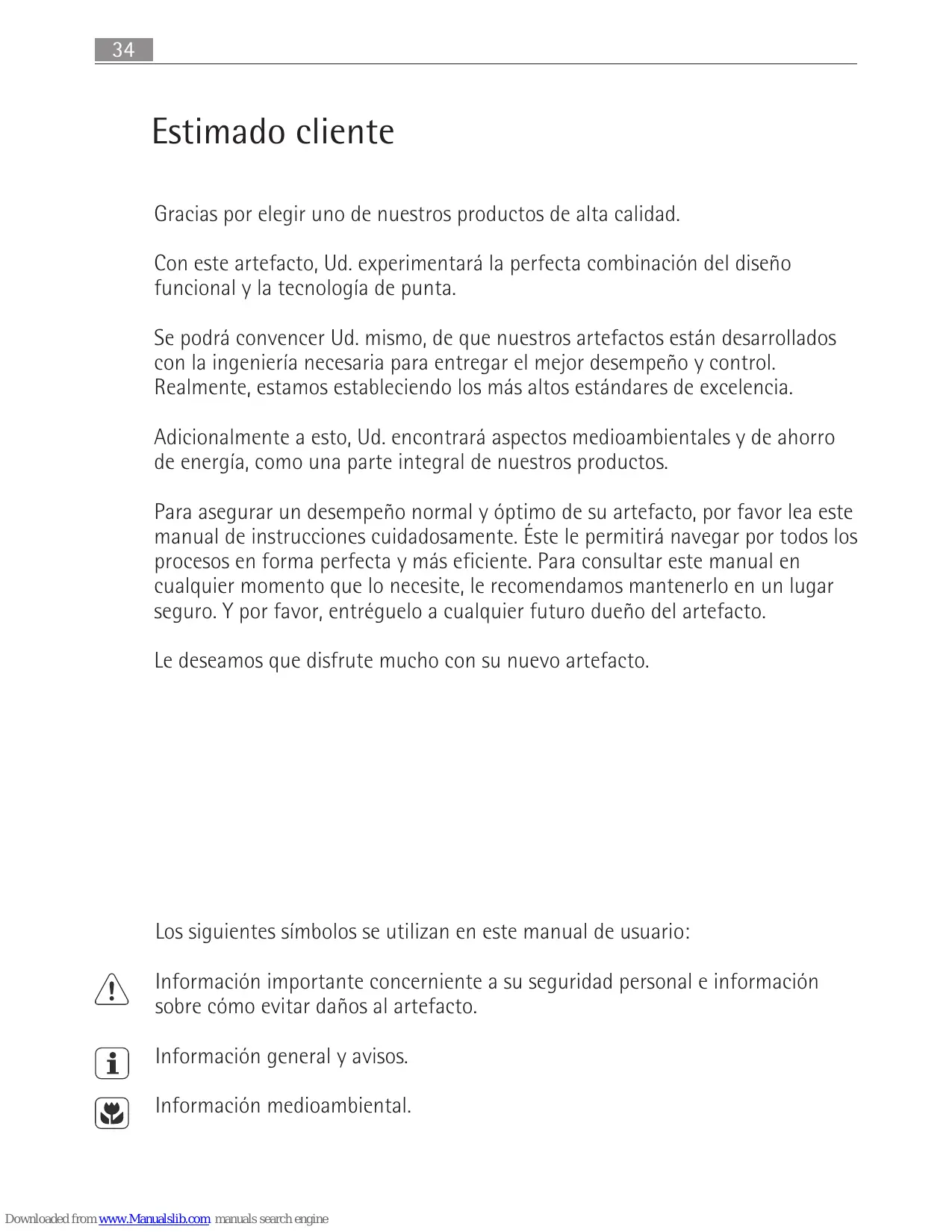 Estimado cliente Gracias por elegir uno de nuestros productos de alta calidad. Con este artefacto, Ud. experimentará la perfecta combinación del diseño funcional y la tecnología de punta. Se podrá convencer Ud. mismo, de que nuestros artefactos están desarrollados con la ingeniería necesaria para entregar el mejor desempeño y control. Realmente, estamos estableciendo los más altos estándares de excelencia. Adicionalmente a esto, Ud. encontrará aspectos medioambientales y de ahorro de energía, como una parte integral de nuestros productos. Para asegurar un desempeño normal y óptimo de su artefacto, por favor lea este manual de instrucciones cuidadosamente. Éste le permitirá navegar por todos los procesos en forma perfecta y más eficiente. Para consultar este manual en cualquier momento que lo necesite, le recomendamos mantenerlo en un lugar seguro. Y por favor, entréguelo a cualquier futuro dueño del artefacto. Le deseamos que disfrute mucho con su nuevo artefacto. Los siguientes símbolos se utilizan en este manual de usuario: Información importante concerniente a su seguridad personal e información sobre cómo evitar daños al artefacto. Información general y avisos. Información medioambiental. Contenido Instrucciones de operación Información sobre seguridad Uso correcto Seguridad general Seguridad para los niños Instalación