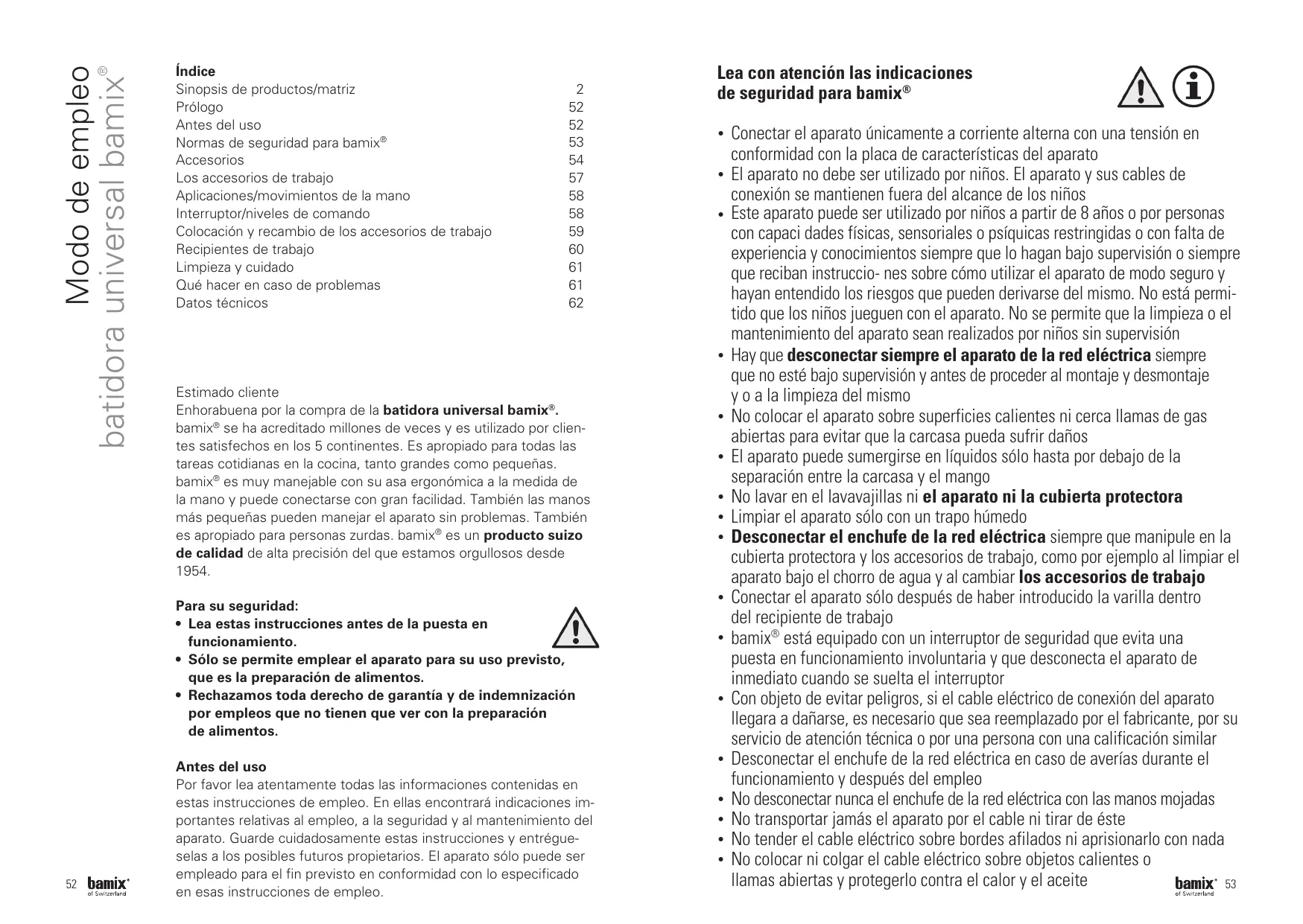Estimado cliente Enhorabuena por la compra de la batidora universal bamix®. bamix® se ha acreditado millones de veces y es utilizado por clientes satisfechos en los 5 continentes. Es apropiado para todas las tareas cotidianas en la cocina, tanto grandes como pequeñas. bamix® es muy manejable con su asa ergonómica a la medida de la mano y puede conectarse con gran facilidad. También las manos más pequeñas pueden manejar el aparato sin problemas. También es apropiado para personas zurdas. bamix® es un producto suizo de calidad de alta precisión del que estamos orgullosos desde Para su seguridad: