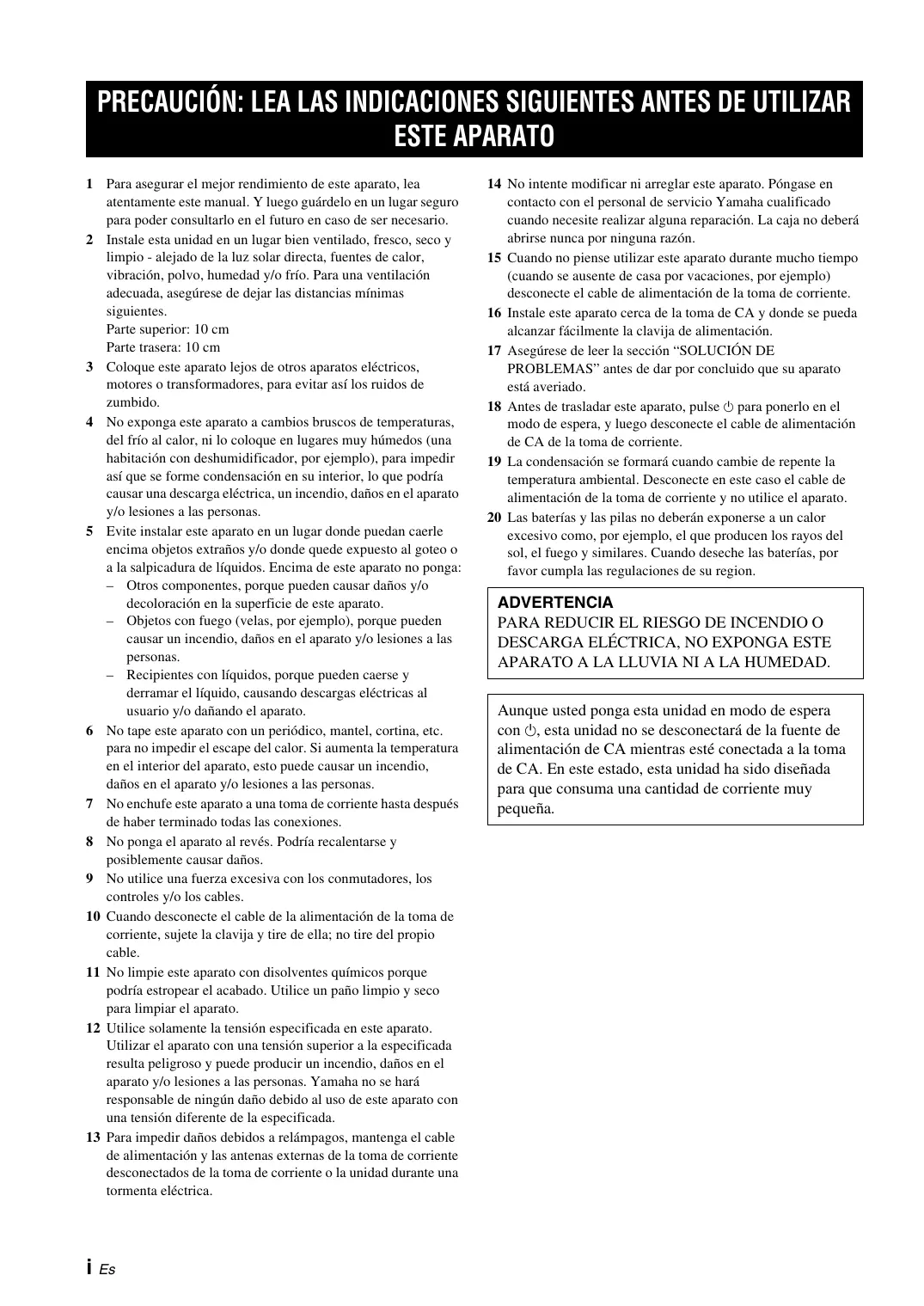 1 Para asegurar el mejor rendimiento de este aparato, lea atentamente este manual. Y luego guárdelo en un lugar seguro para poder consultarlo en el futuro en caso de ser necesario. 2 Instale esta unidad en un lugar bien ventilado, fresco, seco y limpio - alejado de la luz solar directa, fuentes de calor, vibración, polvo, humedad y/o frío. Para una ventilación adecuada, asegúrese de dejar las distancias mínimas siguientes. Parte superior: 10 cm Parte trasera: 10 cm 3 Coloque este aparato lejos de otros aparatos eléctricos, motores o transformadores, para evitar así los ruidos de zumbido. 4 No exponga este aparato a cambios bruscos de temperaturas, del frío al calor, ni lo coloque en lugares muy húmedos (una habitación con deshumidificador, por ejemplo), para impedir así que se forme condensación en su interior, lo que podría causar una descarga eléctrica, un incendio, daños en el aparato y/o lesiones a las personas. 5 Evite instalar este aparato en un lugar donde puedan caerle encima objetos extraños y/o donde quede expuesto al goteo o a la salpicadura de líquidos. Encima de este aparato no ponga: – Otros componentes, porque pueden causar daños y/o decoloración en la superficie de este aparato. – Objetos con fuego (velas, por ejemplo), porque pueden causar un incendio, daños en el aparato y/o lesiones a las personas. – Recipientes con líquidos, porque pueden caerse y derramar el líquido, causando descargas eléctricas al usuario y/o dañando el aparato. 6 No tape este aparato con un periódico, mantel, cortina, etc. para no impedir el escape del calor. Si aumenta la temperatura en el interior del aparato, esto puede causar un incendio, daños en el aparato y/o lesiones a las personas. 7 No enchufe este aparato a una toma de corriente hasta después de haber terminado todas las conexiones. 8 No ponga el aparato al revés. Podría recalentarse y posiblemente causar daños. 9 No utilice una fuerza excesiva con los conmutadores, los controles y/o los cables. 10 Cuando desconecte el cable de la alimentación de la toma de corriente, sujete la clavija y tire de ella; no tire del propio cable. 11 No limpie este aparato con disolventes químicos porque podría estropear el acabado. Utilice un paño limpio y seco para limpiar el aparato. 12 Utilice solamente la tensión especificada en este aparato. Utilizar el aparato con una tensión superior a la especificada resulta peligroso y puede producir un incendio, daños en el aparato y/o lesiones a las personas. Yamaha no se hará responsable de ningún daño debido al uso de este aparato con una tensión diferente de la especificada. 13 Para impedir daños debidos a relámpagos, mantenga el cable de alimentación y las antenas externas de la toma de corriente desconectados de la toma de corriente o la unidad durante una tormenta eléctrica.
