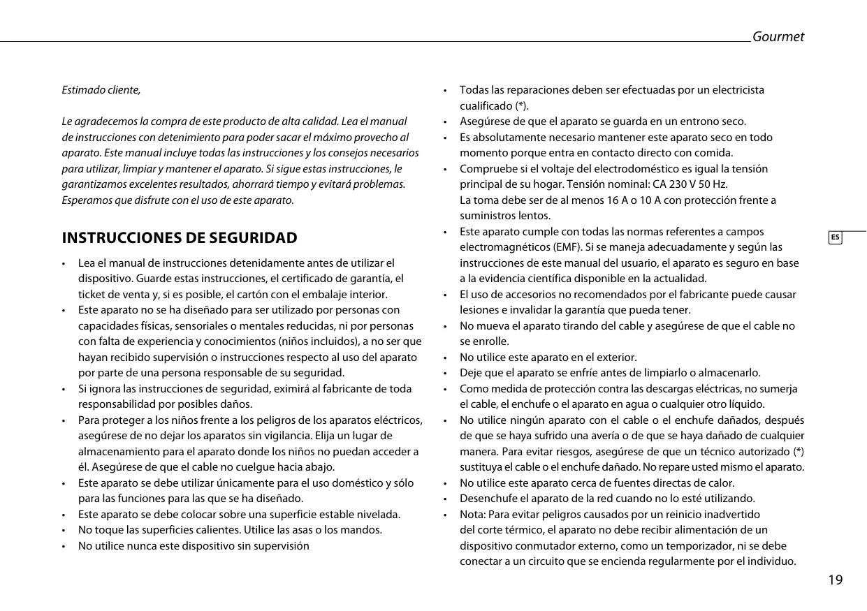 Todas las reparaciones deben ser efectuadas por un electricista cualificado (*). Asegúrese de que el aparato se guarda en un entrono seco. Es absolutamente necesario mantener este aparato seco en todo momento porque entra en contacto directo con comida. Compruebe si el voltaje del electrodoméstico es igual la tensión principal de su hogar. Tensión nominal: CA 230 V 50 Hz. La toma debe ser de al menos 16 A o 10 A con protección frente a suministros lentos. Este aparato cumple con todas las normas referentes a campos electromagnéticos (EMF). Si se maneja adecuadamente y según las instrucciones de este manual del usuario, el aparato es seguro en base a la evidencia científica disponible en la actualidad. El uso de accesorios no recomendados por el fabricante puede causar lesiones e invalidar la garantía que pueda tener. No mueva el aparato tirando del cable y asegúrese de que el cable no se enrolle. No utilice este aparato en el exterior. Deje que el aparato se enfríe antes de limpiarlo o almacenarlo. Como medida de protección contra las descargas eléctricas, no sumerja el cable, el enchufe o el aparato en agua o cualquier otro líquido. No utilice ningún aparato con el cable o el enchufe dañados, después de que se haya sufrido una avería o de que se haya dañado de cualquier manera. Para evitar riesgos, asegúrese de que un técnico autorizado (*) sustituya el cable o el enchufe dañado. No repare usted mismo el aparato. No utilice este aparato cerca de fuentes directas de calor. Desenchufe el aparato de la red cuando no lo esté utilizando. Nota: Para evitar peligros causados por un reinicio inadvertido del corte térmico, el aparato no debe recibir alimentación de un dispositivo conmutador externo, como un temporizador, ni se debe conectar a un circuito que se encienda regularmente por el individuo.
