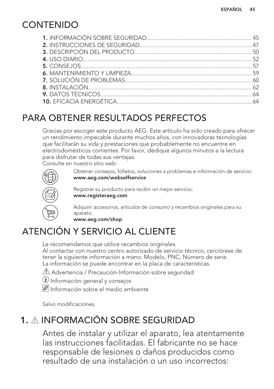 Gracias por escoger este producto AEG. Este artículo ha sido creado para ofrecer un rendimiento impecable durante muchos años, con innovadoras tecnologías que facilitarán su vida y prestaciones que probablemente no encuentre en electrodomésticos corrientes. Por favor, dedique algunos minutos a la lectura para disfrutar de todas sus ventajas. Consulte en nuestro sitio web: Obtener consejos, folletos, soluciones a problemas e información de servicio: www.aeg.com/webselfservice Registrar su producto para recibir un mejor servicio: www.registeraeg.com Adquirir accesorios, artículos de consumo y recambios originales para su aparato: www.aeg.com/shop