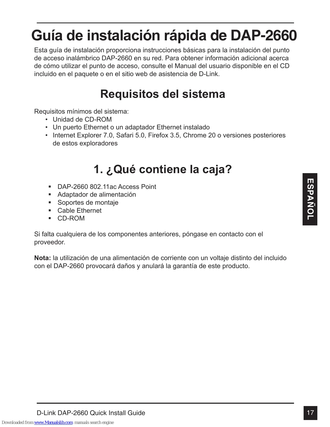 Si falta cualquiera de los componentes anteriores, póngase en contacto con el proveedor. Nota: la utilización de una alimentación de corriente con un voltaje distinto del incluido con el DAP-2660 provocará daños y anulará la garantía de este producto.
