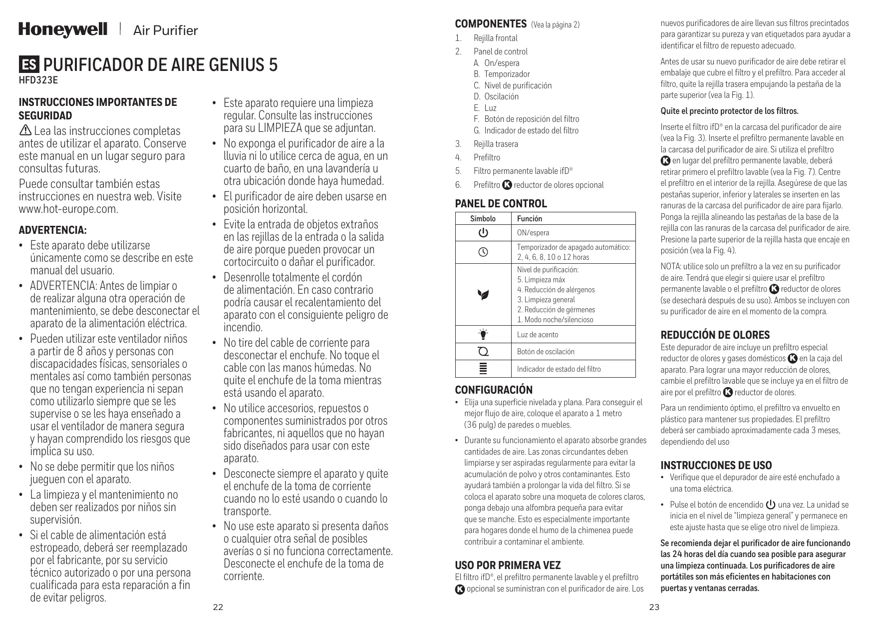 Tensión 2014/35/UE y la Directiva RoHS 2011/65/UE. Nos reservamos el derecho a introducir modificaciones técnicas HFD323E Rangez dans une salle de bain, une buanderie ou soigneusement ce mode d’emploi en un autre lieu humide. cas de besoin ultérieur. Air Purifier • Le purificateur d’air doit être utilisé en Ces instructions sont également position verticale. disponibles sur notre site Internet. Veuillez consulter le site • Ne laissez pas d’objets étrangers pénétrer www.hot-europe.com. dans les grilles d’admission ou d’évacuation de l’air, sous peine de provoquer un choc AVERTISSEMENT : électrique ou d’endommager le purificateur • Cet appareil doit être utilisé conformément d’air. aux instructions figurant dans ce mode • Déroulez entièrement le cordon d’emploi. d’alimentation. À défaut, vous risquez de • AVERTISSEMENT : Avant le nettoyage ou provoquer une surchauffe ou un risque toute autre intervention de l’utilisateur, d’incendie. l’appareil doit être débranché de • Ne tirez pas sur le cordon d’alimentation l’alimentation principale. pour débrancher la fiche. Ne touchez • Cet appareil peut être utilisé par les enfants pas le cordon d’alimentation avec les à partir de 8 ans et par les personnes ayant mains humides. Ne retirez pas la fiche une invalidité physique, sensorielle ou d’alimentation de la prise électrique alors mentale, ou n’ayant jamais manipulé ou que le produit est en cours d’utilisation. ne connaissant pas cet appareil, s’ils sont • N’utilisez pas d’accessoires, de pièces encadrés ou s’ils ont reçu des instructions de rechange ou de composants fournis concernant l’utilisation sûre de cet appareil par d’autres fabricants et qui ne sont pas et s’ils comprennent les dangers associés. conçus pour être utilisés avec cet appareil. • Les enfants ne doivent pas jouer avec cet • Mettez systématiquement l’appareil appareil. hors tension puis débranchez la fiche • Le nettoyage et l’entretien ne doivent d’alimentation de la prise électrique lorsque pas être effectués par des enfants sans l’appareil n’est pas utilisé ou durant son surveillance. transport. • Si le cordon d’alimentation est • N’utilisez pas cet appareil s’il est endommagé, il doit être remplacé par le endommagé, s’il présente d’éventuels fabricant, son agent de maintenance ou signes de dommage ou s’il ne fonctionne toute autre personne qualifiée, afin d’éviter pas correctement. Débranchez-le de la tout danger. prise électrique. CONSIGNES DE SÉCURITÉ IMPORTANTES