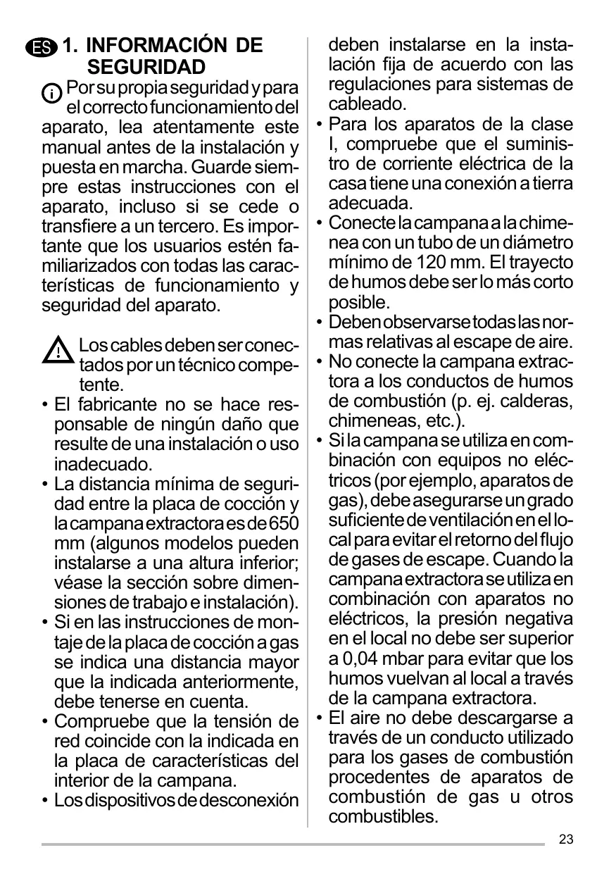• Los cables deben ser conectados por un técnico compe- • tente. • El fabricante no se hace responsable de ningún daño que resulte de una instalación o uso • inadecuado. • La distancia mínima de seguridad entre la placa de cocción y la campana extractora es de 650 mm (algunos modelos pueden instalarse a una altura inferior; véase la sección sobre dimensiones de trabajo e instalación). • Si en las instrucciones de montaje de la placa de cocción a gas se indica una distancia mayor que la indicada anteriormente, debe tenerse en cuenta. • Compruebe que la tensión de • red coincide con la indicada en la placa de características del interior de la campana. • Los dispositivos de desconexión