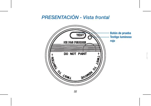 Pruebe su detector ( accione el boton «test») una señal sonora debe producirse. Ponga en línea la placa y el detector, y gírelo en el sentido de las agujas del reloj para fijar ambos elementos. Compruebe que el detector está correctamente instalado en su placa. ¡ATENCIÓN! Para poder fijar el detector a la placa, debe haber instalado antes una pila en el compartimento. Si no hay ninguna pila instalada, el dispositivo de seguridad sobresale de manera que impide que el detector gire sobre la placa. 45