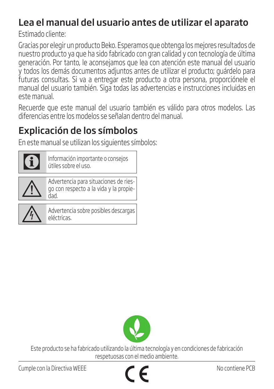 Gracias por elegir un produit Beko. Esperamos que Obtenga los最好的 resultados de nuestro producto ya que ha sido fabricado con gran calidad y con Tecnología deULTima generación. Por tanto, le acontejamos que lea con atencion este manual del usuario y todos los demas documents adjuntos antes de utiliser el producto; guardelo para futuras consultas. Si va a registrar este producto a otra persona, proportionele elmanual del usuario también. Siga todas las advertencias e instrucciones incluidas en este manual.