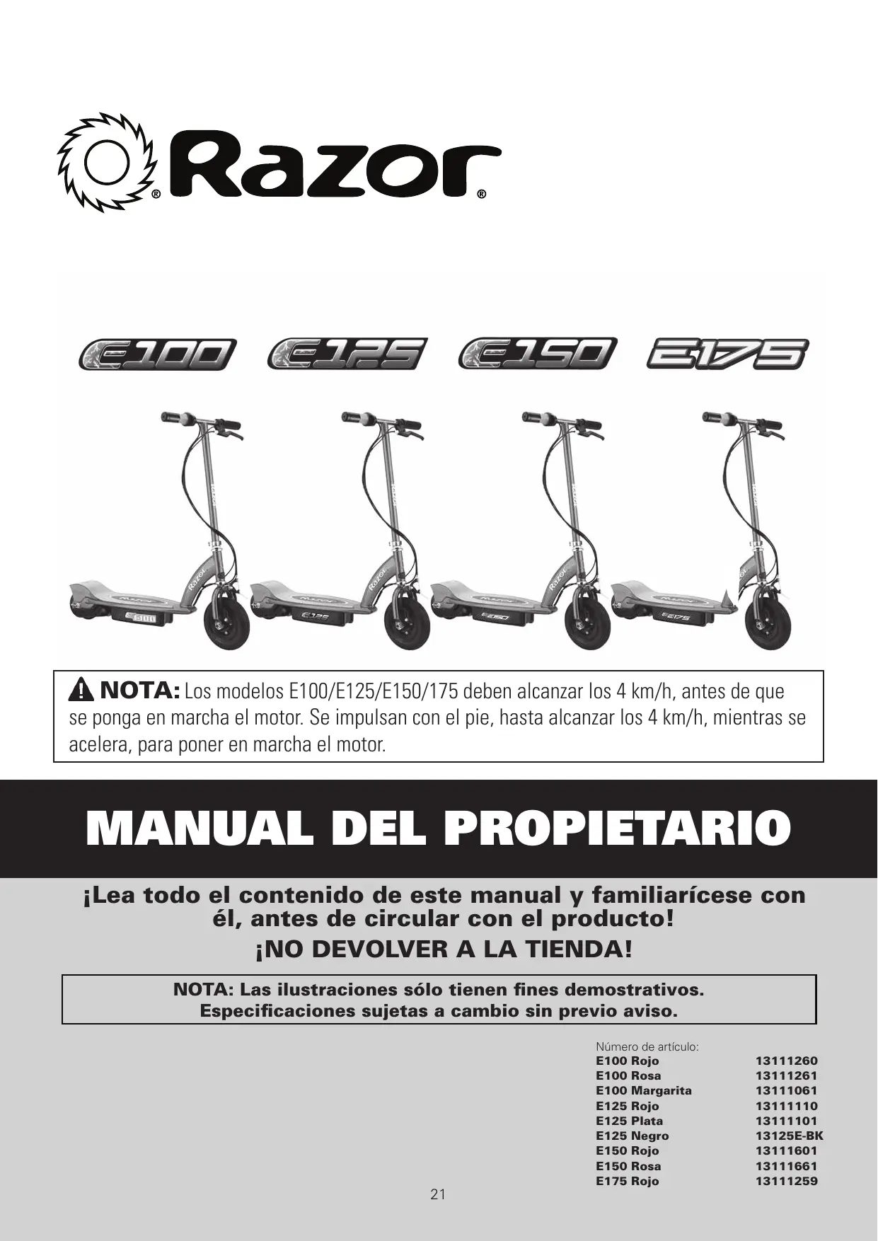 Descarga las instrucciones para tu Patinete electrico en formato PDF gratis! Encuentra tus instrucciones E100 GLOW - RAZOR y toma tu dispositivo electrónico nuevamente en la mano. En esta página están publicados todos los documentos necesarios para el uso de su dispositivo. E100 GLOW de la marca RAZOR.