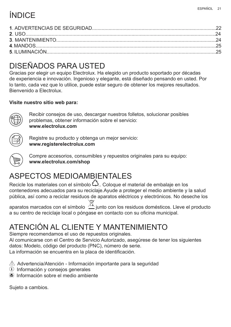 Gracias por elegir un equipo Electrolux. Ha elegido un producto soportado por décadas de experiencia e innovación. Ingenioso y elegante, está diseñado pensando en usted. Por lo tanto, cada vez que lo utilice, puede estar seguro de obtener los mejores resultados. Bienvenido a Electrolux. Visite nuestro sitio web para: Recibir consejos de uso, descargar nuestros folletos, solucionar posibles problemas, obtener información sobre el servicio: www.electrolux.com Registre su producto y obtenga un mejor servicio: www.registerelectrolux.com Compre accesorios, consumibles y repuestos originales para su equipo: www.electrolux.com/shop