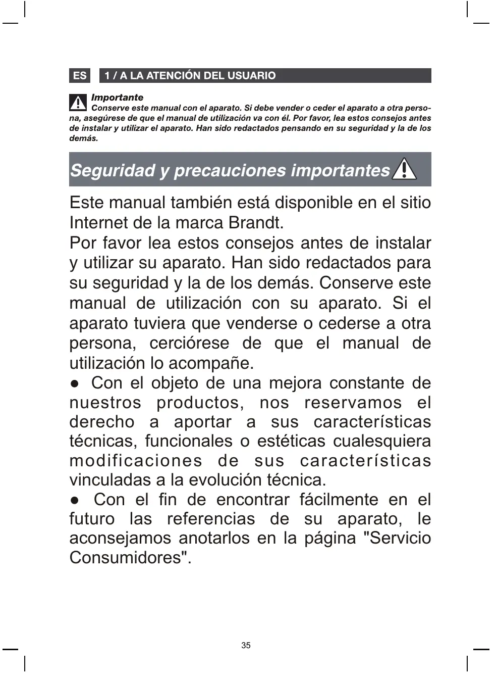 Importante Conserve este manual con el aparato. Si debe vender o ceder el aparato a otra perso- na, asegürese de que el manual de utilizacién va con él. Por favor, lea estos consejos antes de instalar y utilizar el aparato. Han sido redactados pensando en su seguridad y la de los demäs. Seguridad y precauciones importantes | Este manual también esté disponible en el sitio Internet de la marca Brandt. Por favor lea estos consejos antes de instalar y utilizar su aparato. Han sido redactados para su seguridad y la de los demäs. Conserve este manual de utilizacién con su aparato. Si el aparato tuviera que venderse o cederse a otra persona, cerciôérese de que el manual de utilizaciôn lo acompañe. e Con el objeto de una mejora constante de nuestros productos, nos reservamos el derecho a aportar a sus caracteristicas técnicas, funcionales o estéticas cualesquiera modificaciones de sus caracteristicas vinculadas a la evoluciôn técnica. e Con el fin de encontrar fâcilmente en el futuro las referencias de su aparato, le aconsejamos anotarlos en la pâgina "Servicio Consumidores".