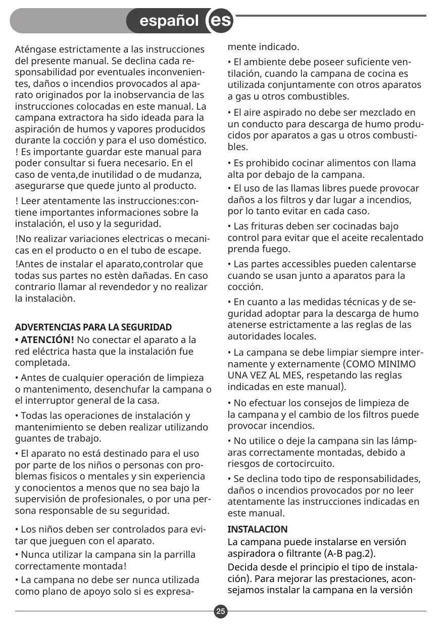 Aténgase estrictamente a las instrucciones del presente manual. Se declina cada responsabilidad por eventuales inconvenientes, daños o incendios provocados al aparato originados por la inobservancia de las instrucciones colocadas en este manual. La campana extractora ha sido ideada para la aspiración de humos y vapores producidos durante la cocción y para el uso doméstico.